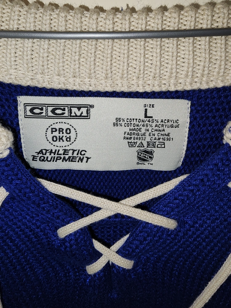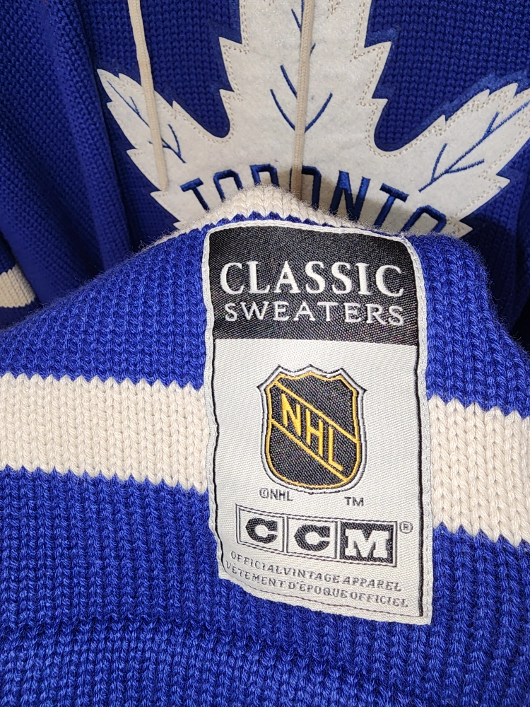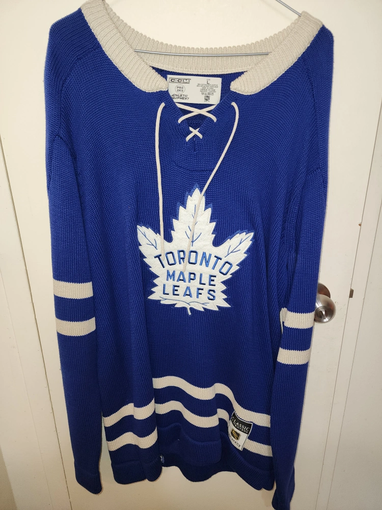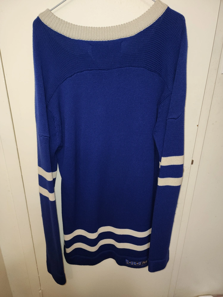 Used, but barely used Classic Blue and white Toronto Maple Leafs hockey sweater. Features a large team logo on the front and white stripes on the sleeves and bottom. Lace up neckline.