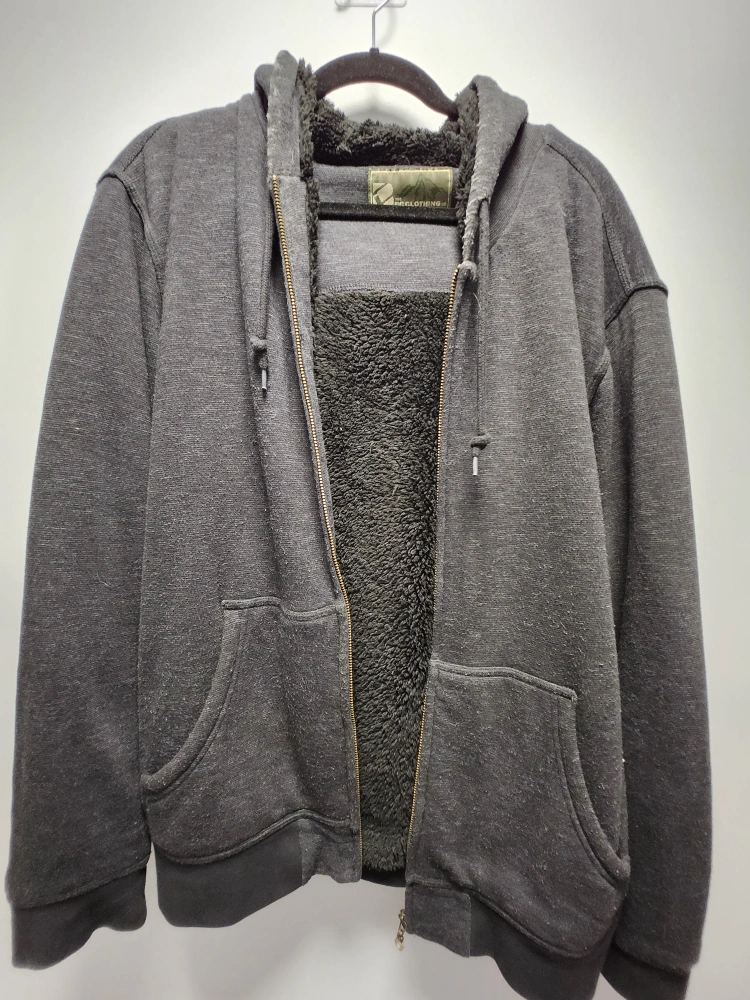 - Grey fleece lined hoodie with a zipper closure. Features a hood and a kangaroo pocket.
