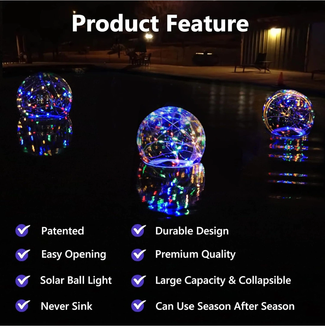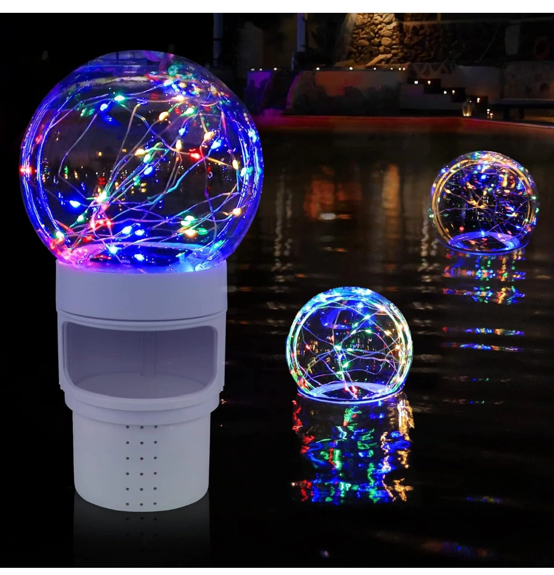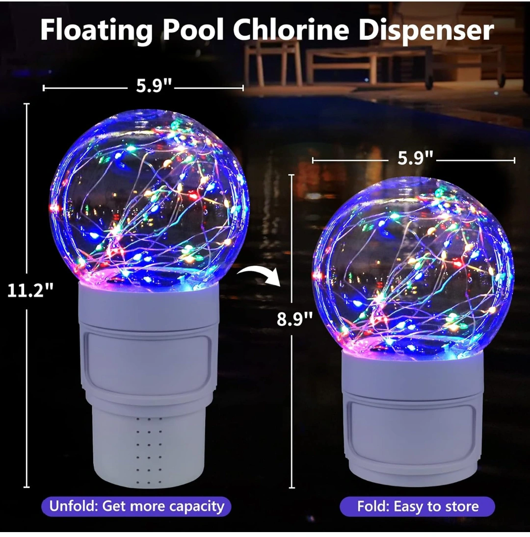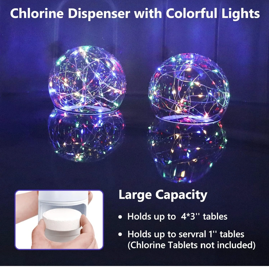 Pool Chlorine Floater with Colorful Solar Ball Lights, Floating Pool Chlorine Dispenser for 4x3” Chlorine Tablets, Easy Opening Chlorine Tablet Holder Floater, Anti-Sinking Spa Chemical Dispenser.
