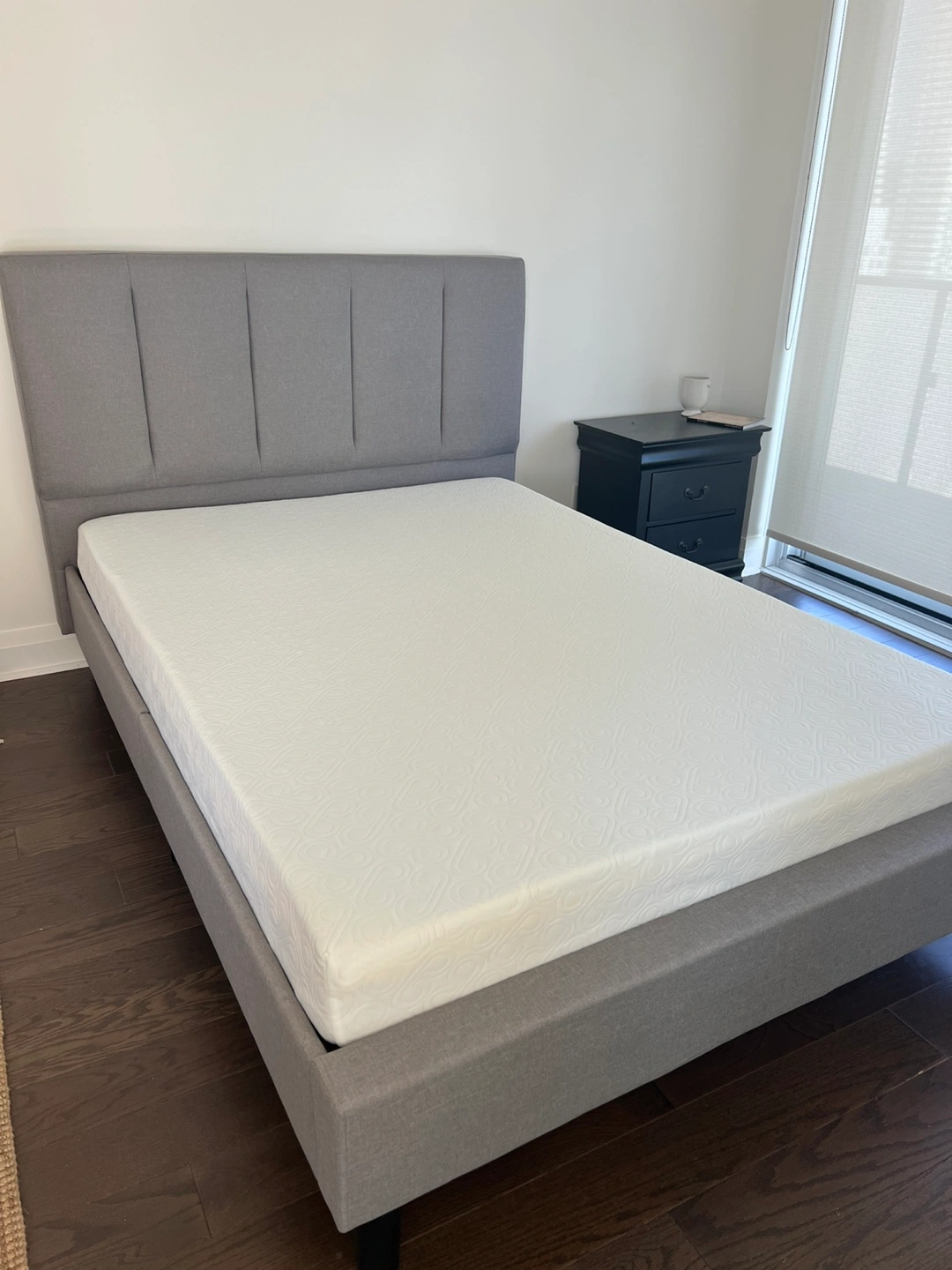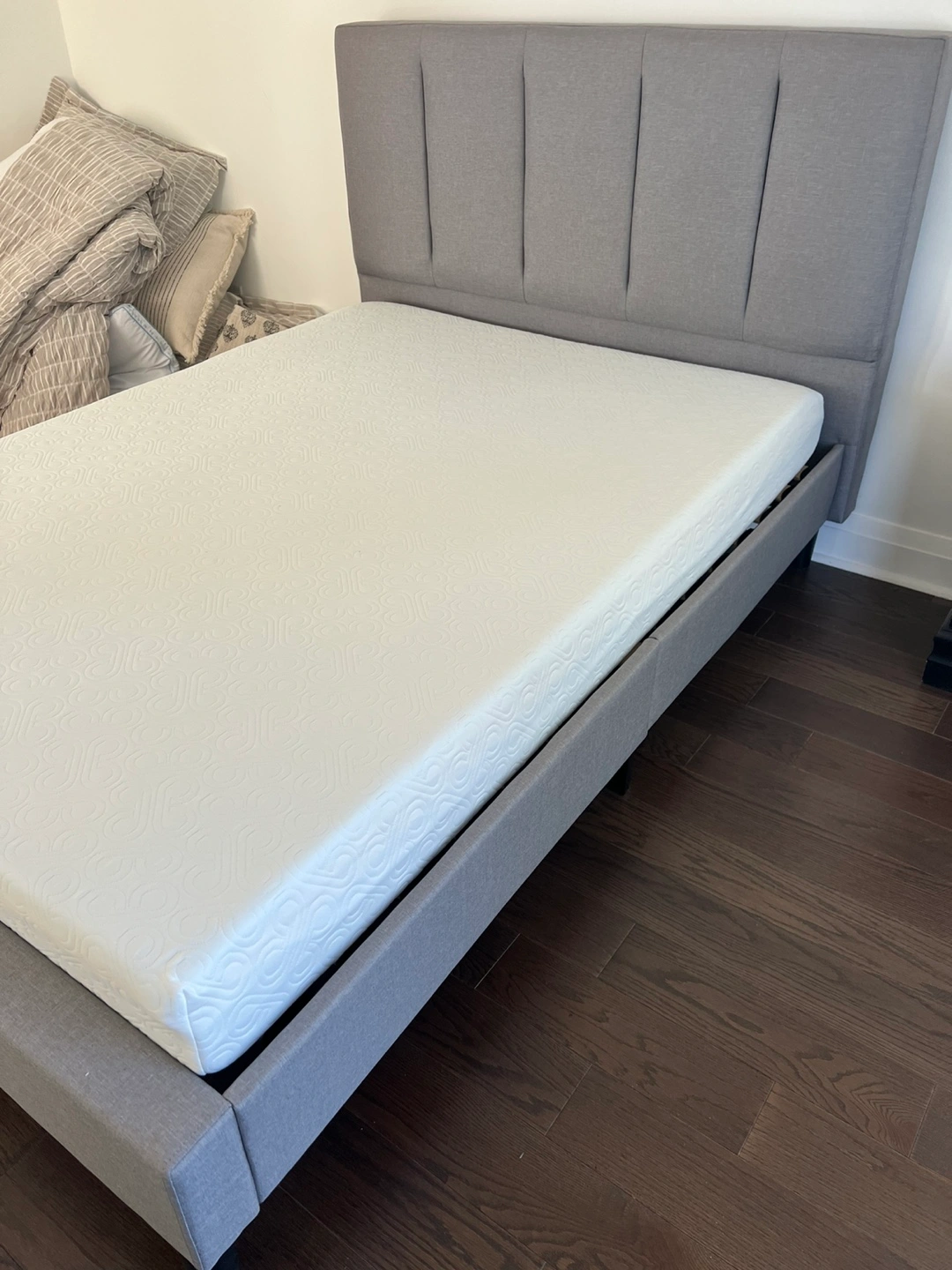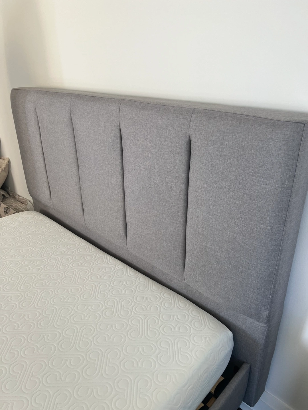 Grey upholstered bed frame with a slatted base. Includes headboard. Mattress is a Bloom mattress. No stains. Bed used as a guest bed so not used a lot. Excellent condition. Near offers considered.
