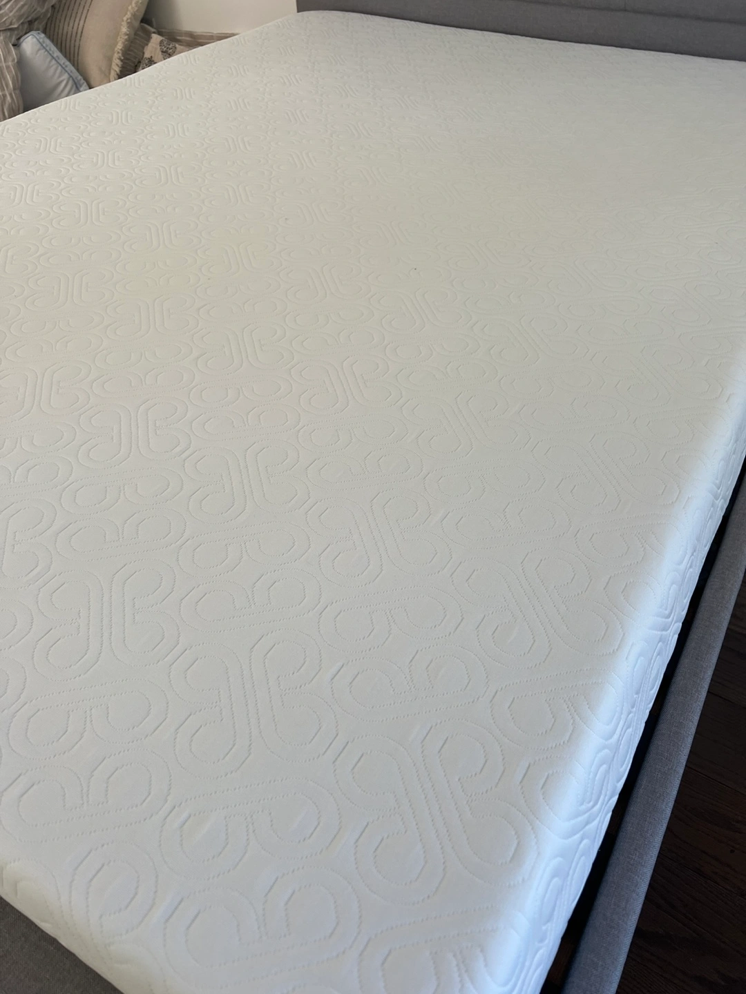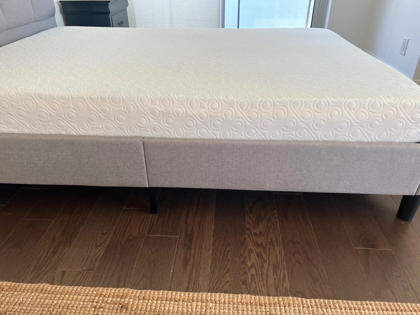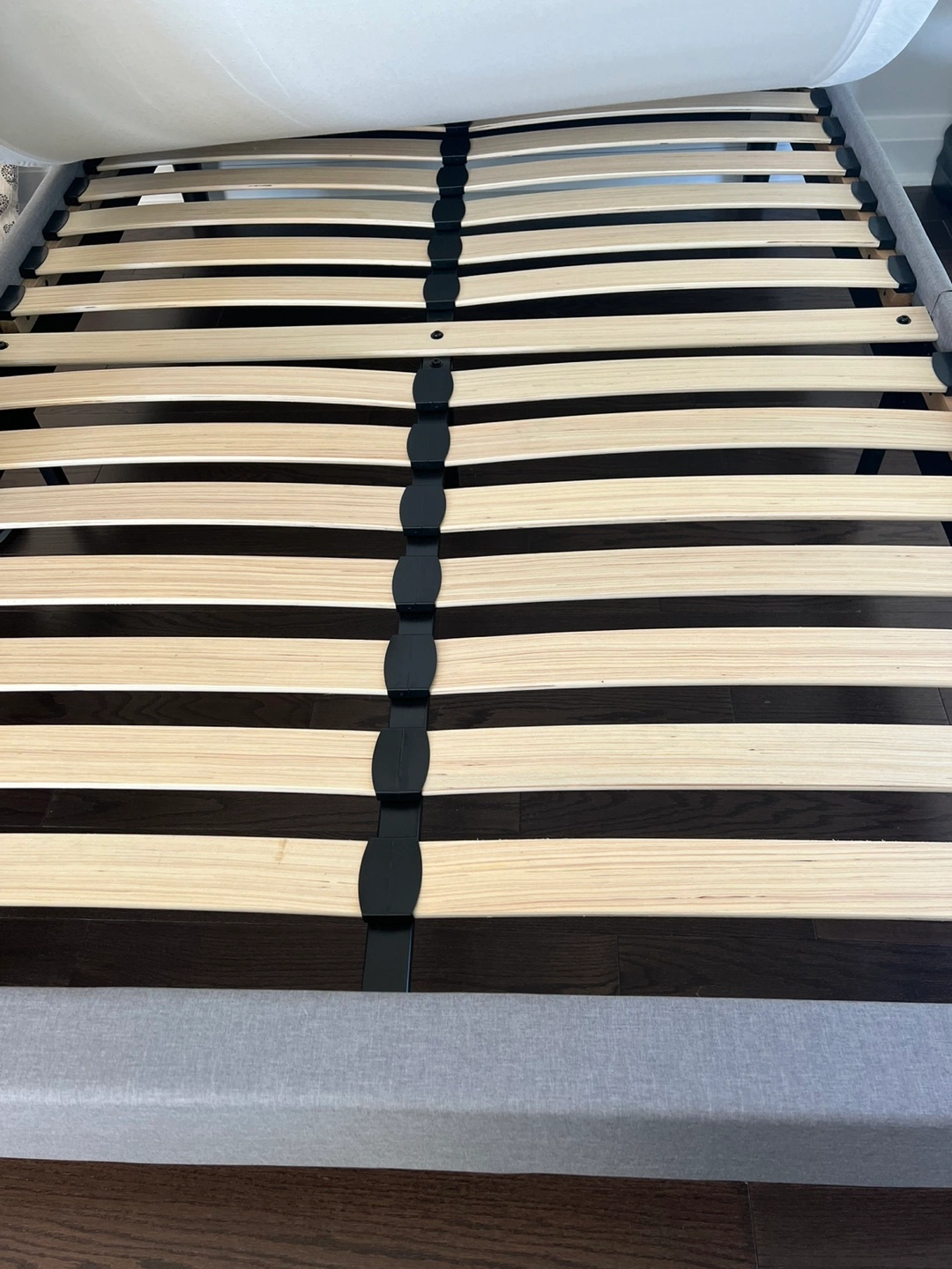 Grey upholstered bed frame with a slatted base. Includes headboard. Mattress is a Bloom mattress. No stains. Bed used as a guest bed so not used a lot. Excellent condition. Near offers considered.