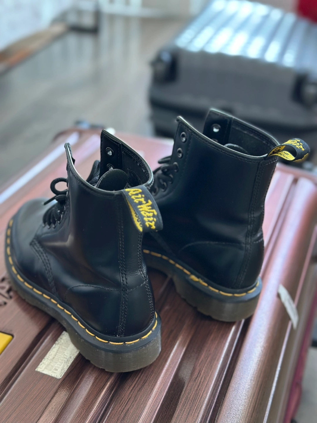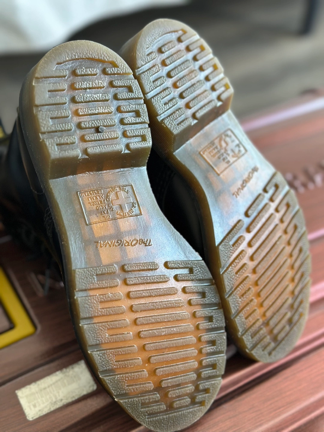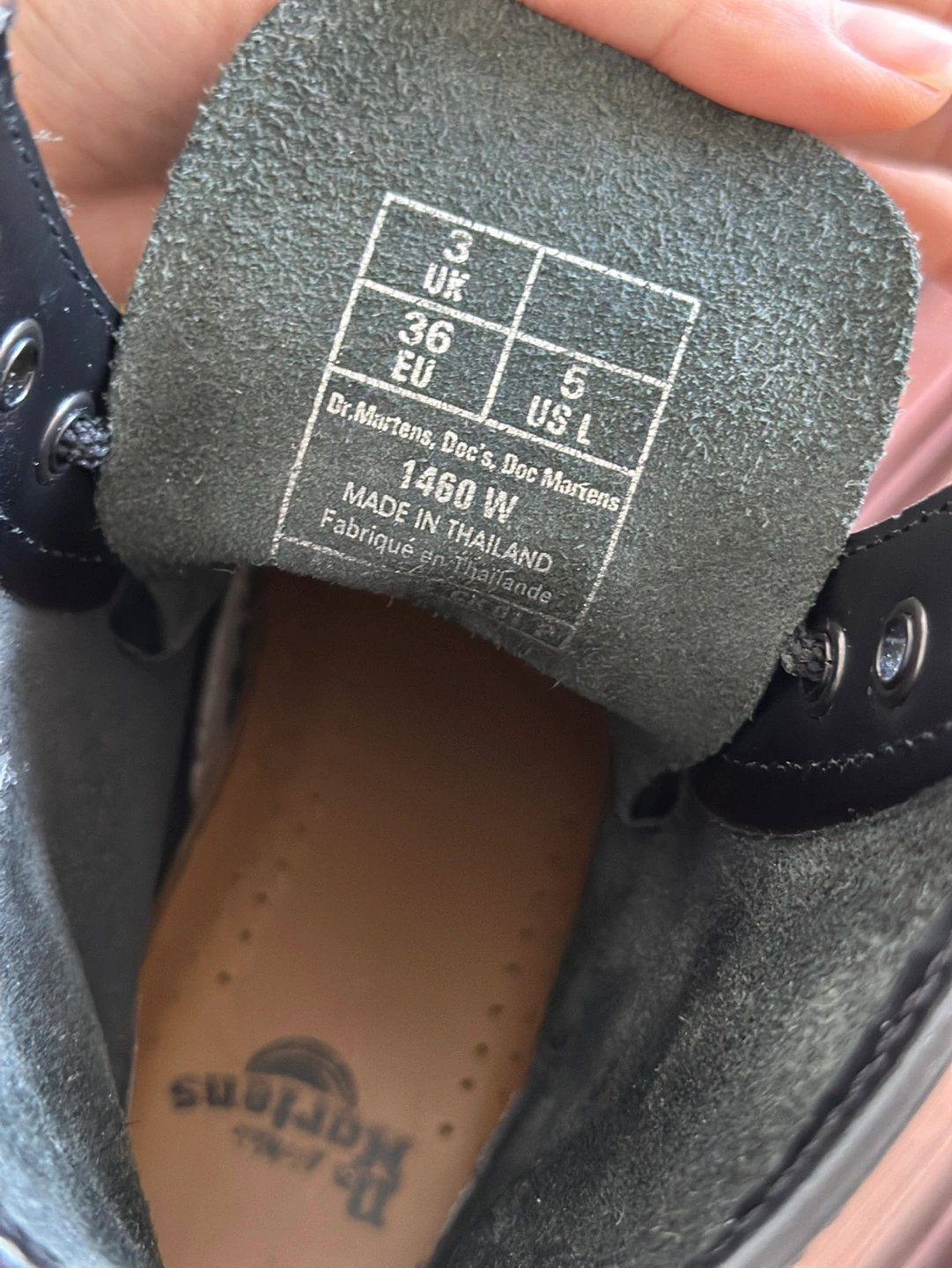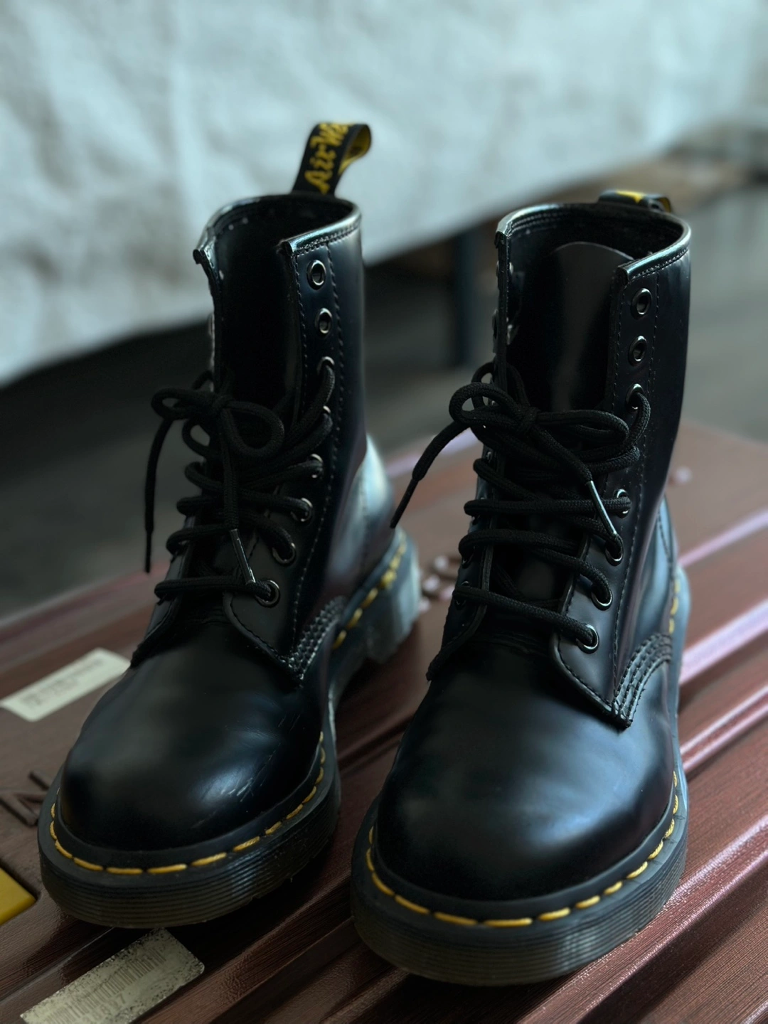 Black leather Dr. Martens 1460 boots. Size 5 US Women's. As you can see, there's just a bit of scratch on the front. Still, it's in a good condition.