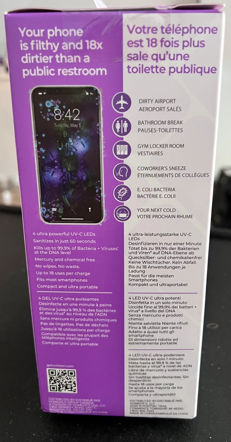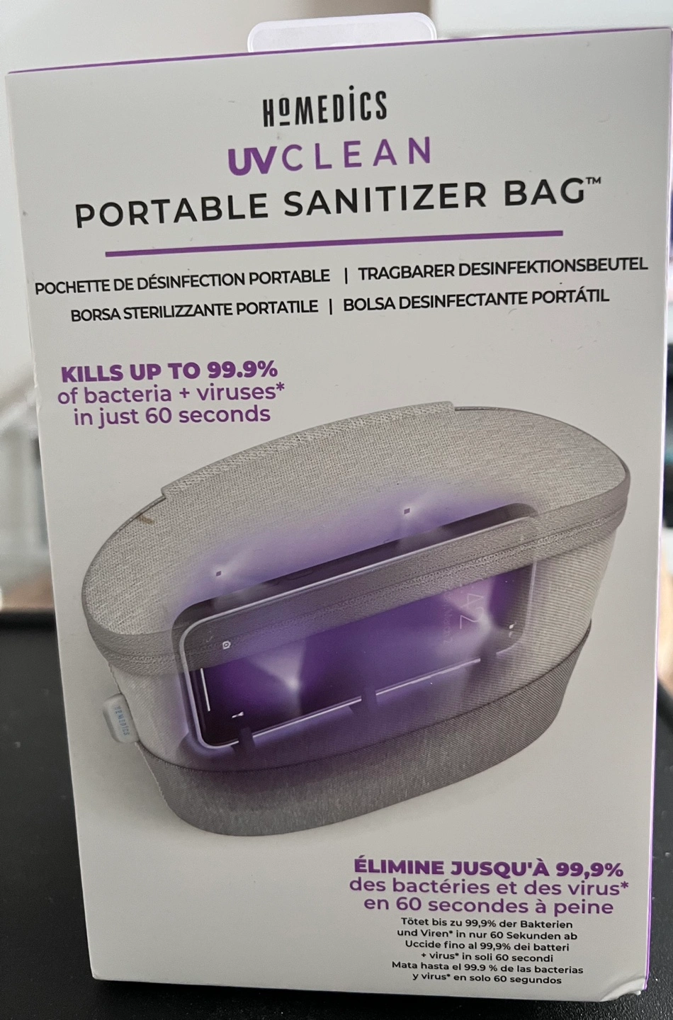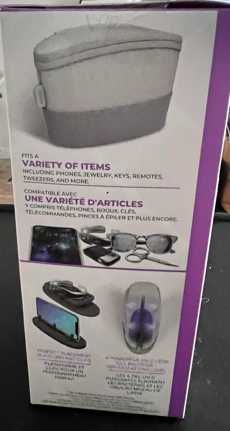 Portable sanitizer bag, kills up to 99.9% of bacteria and viruses in 60 seconds. Fits a variety of items including phones, jewelry, keys, remotes, tweezers and more.