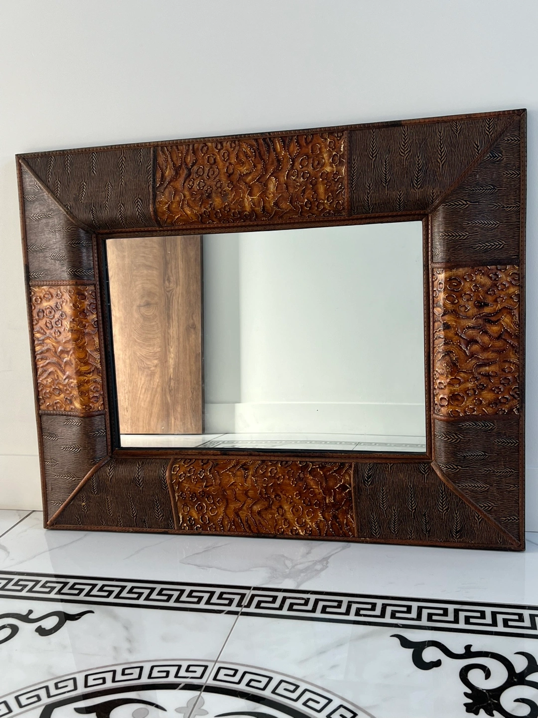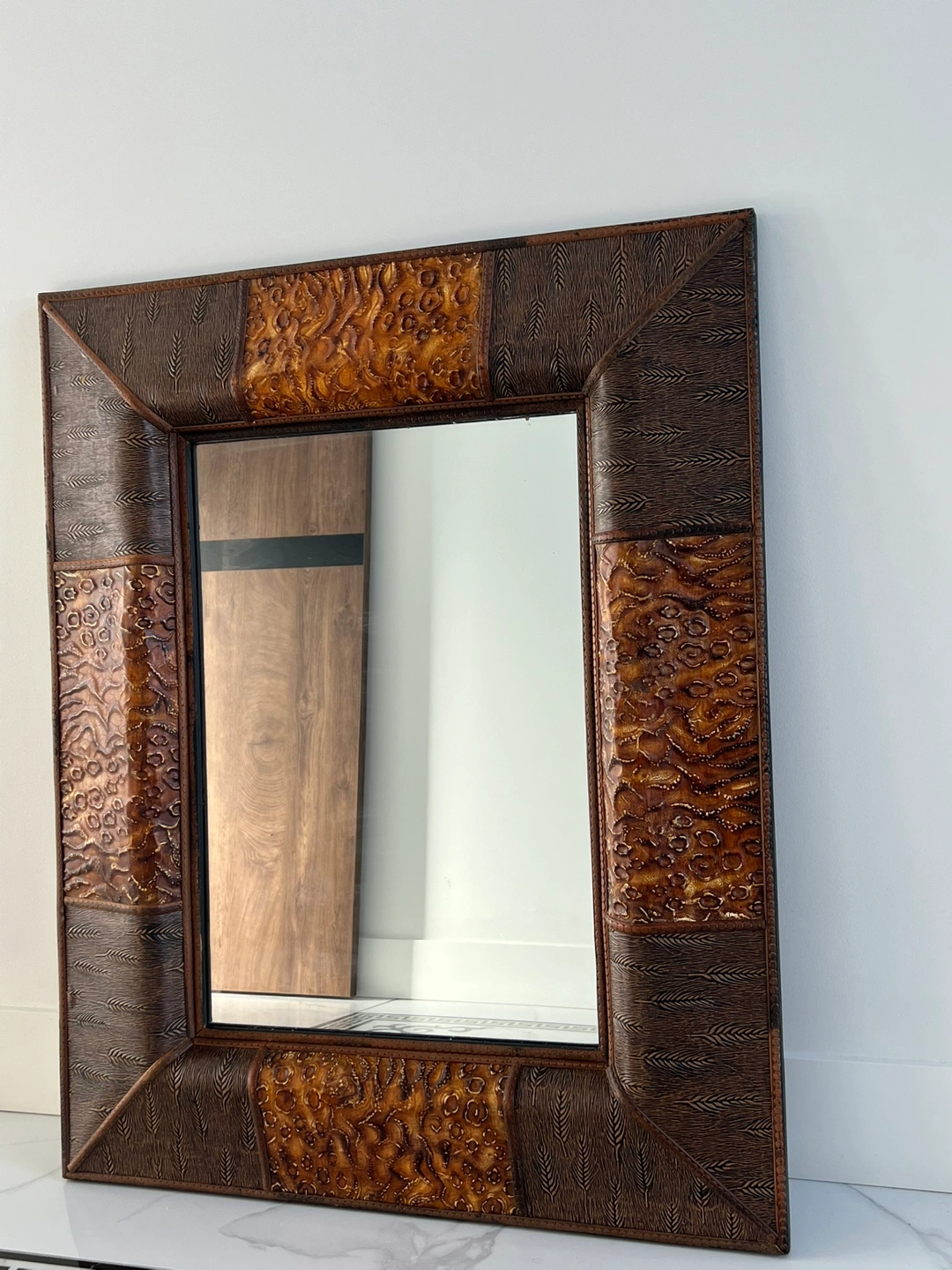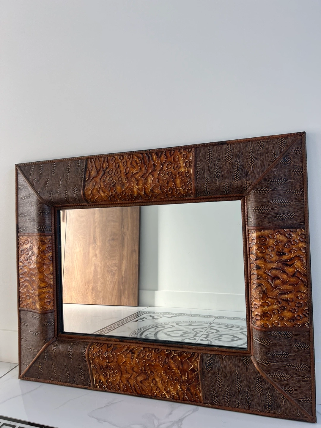 Large mirror with an embossed decorative frame. Brown and tan colours. Can hang horizontally and or vertically.
