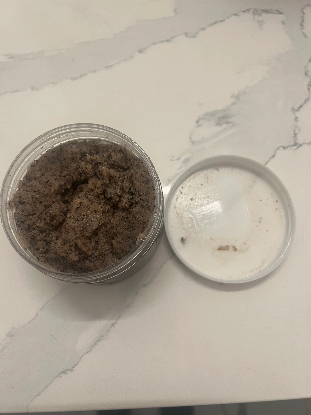 Coffee, coconut, shea butter, and vitamin E. An intense natural body scrub to tighten, brighten and diminish the appearance of skin imperfections.