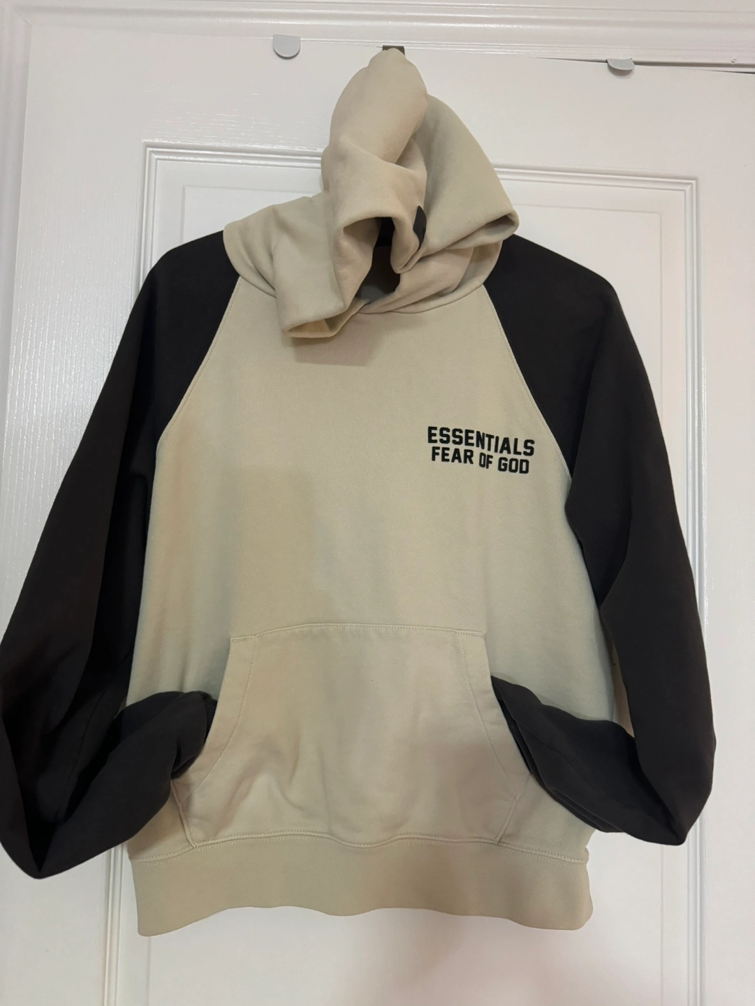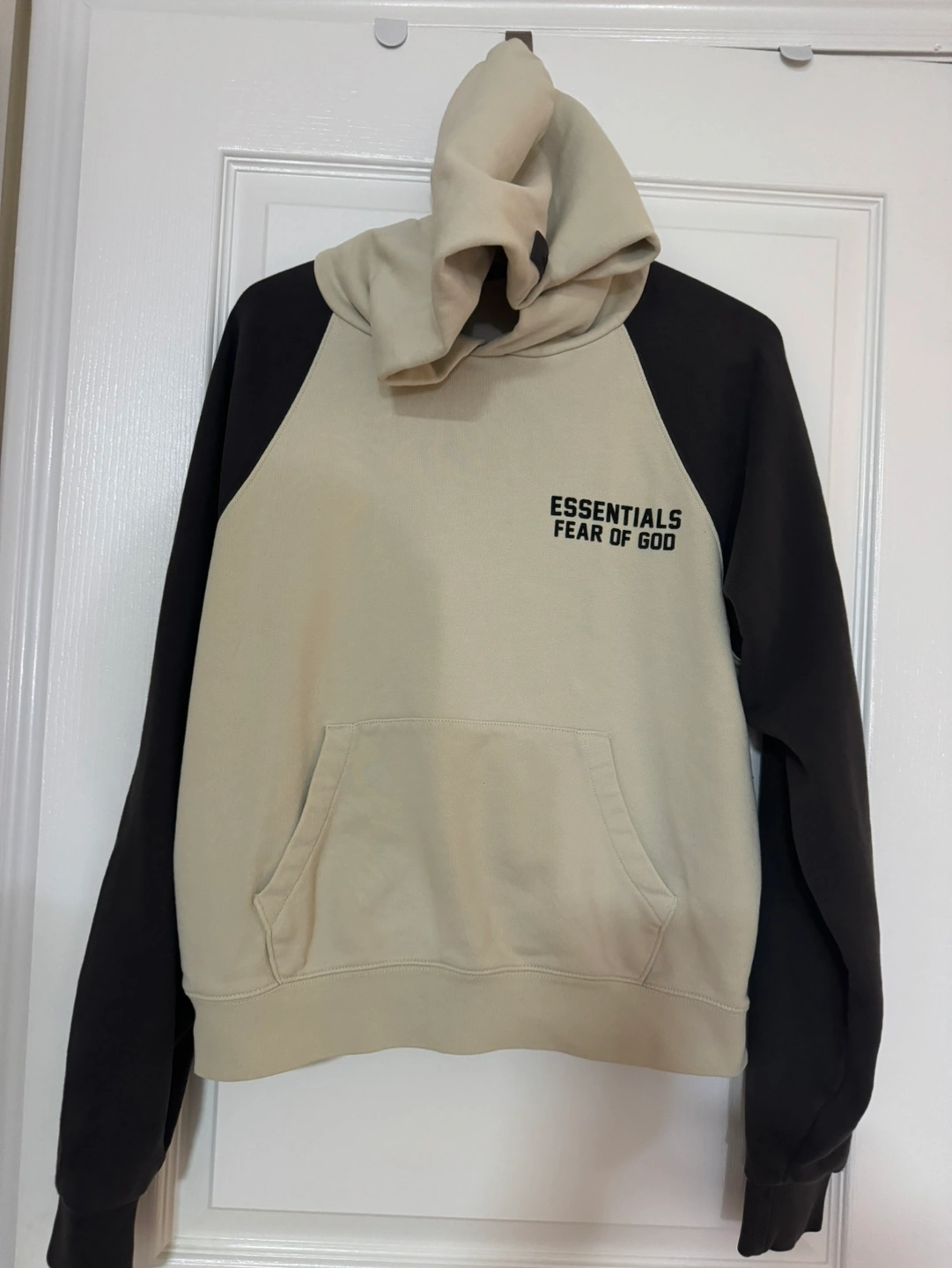 Beige and black colour, long sleeve, with a front pouch pocket. Has Fear of God logo on the front. Medium $20 Yonge and Finch