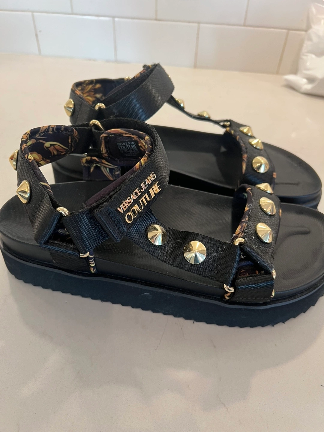 Versace Jeans Couture black sandals with gold accents, straps, and studs. Platform sole. Unworn, purchased from SSENSE