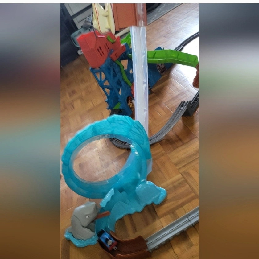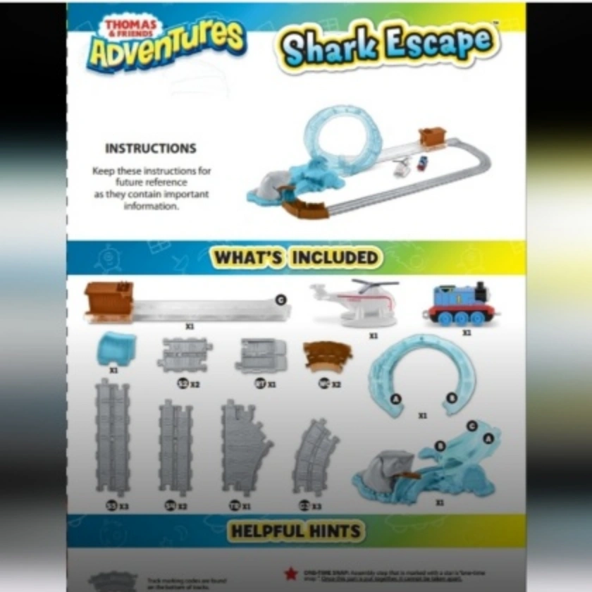 Thomas Adventure set with shark, helicopter, and track pieces. Includes a Thomas train..
