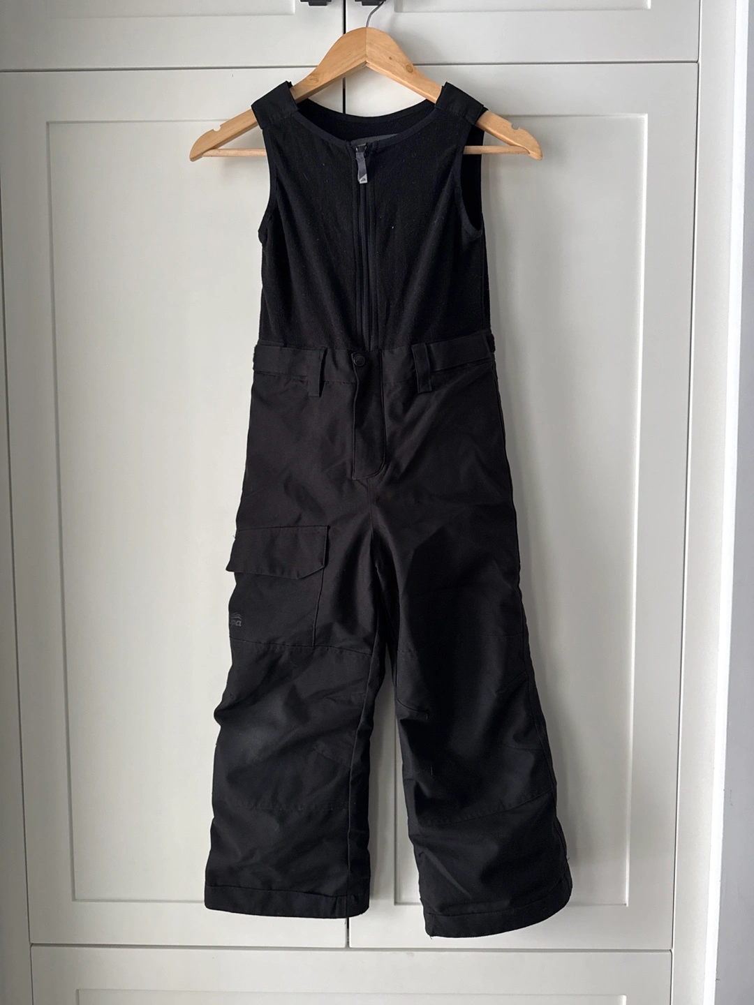 Black ski bib with fleece top, size 6. Room to grow. Never been unstitched. Waterproof, breathable, and washable.