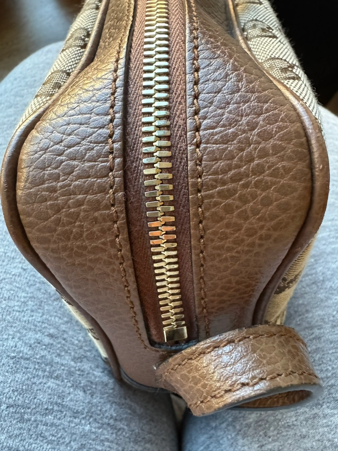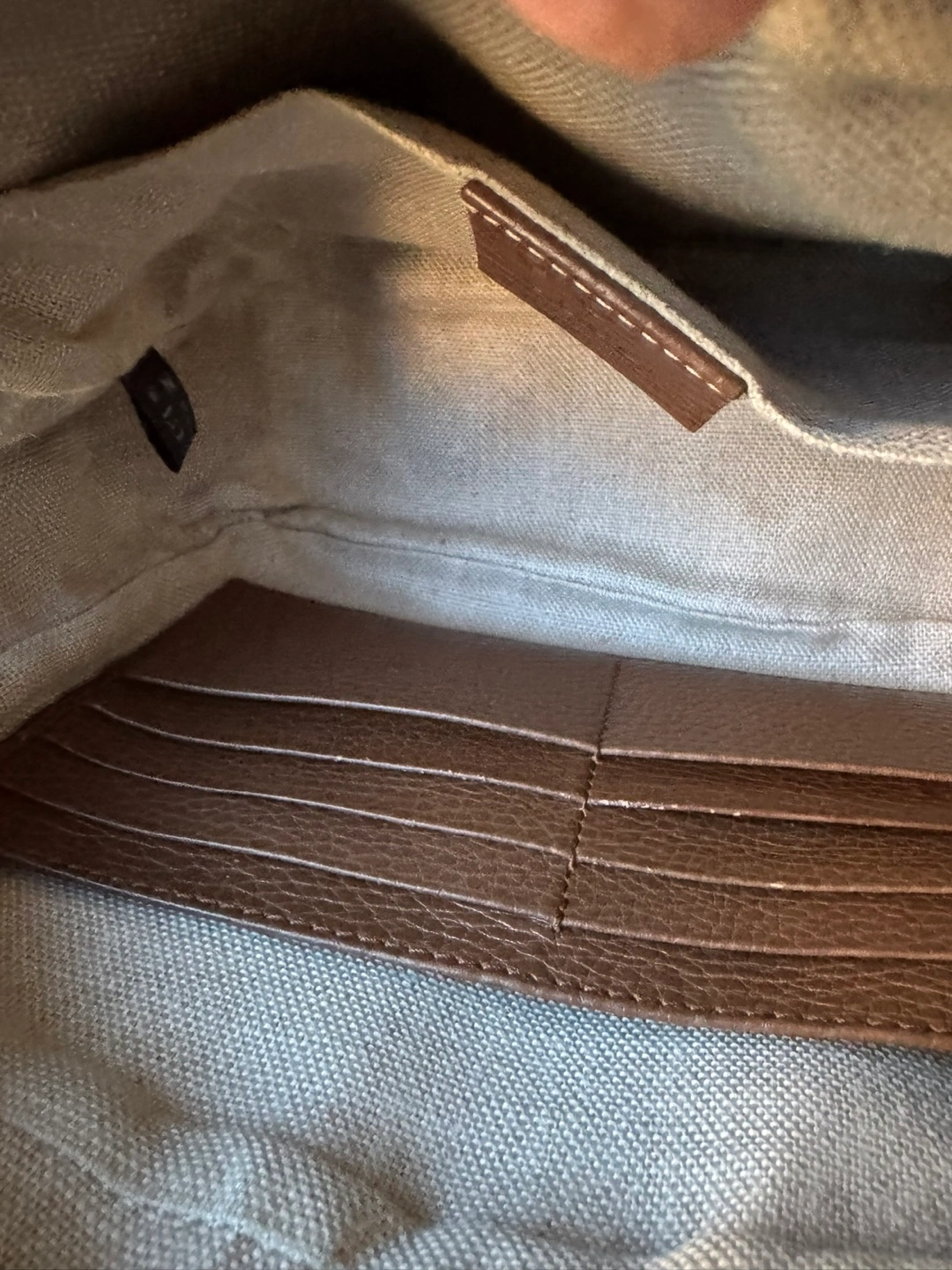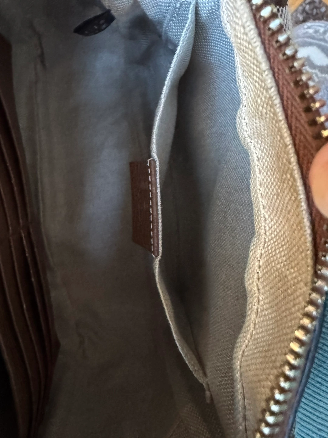 Brown leather and canvas. A lot of space and cardholders inside the bag. Two slip pockets. Gold hardware. Canvas lining/clean!