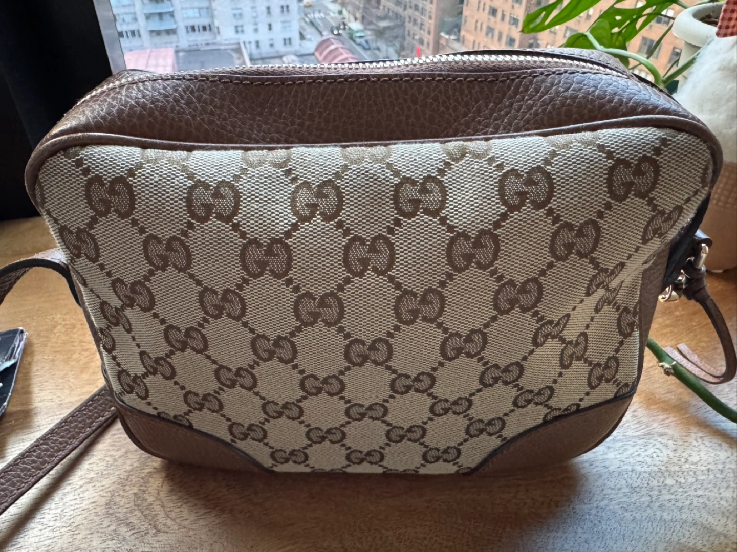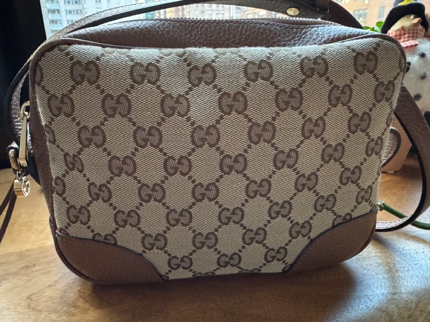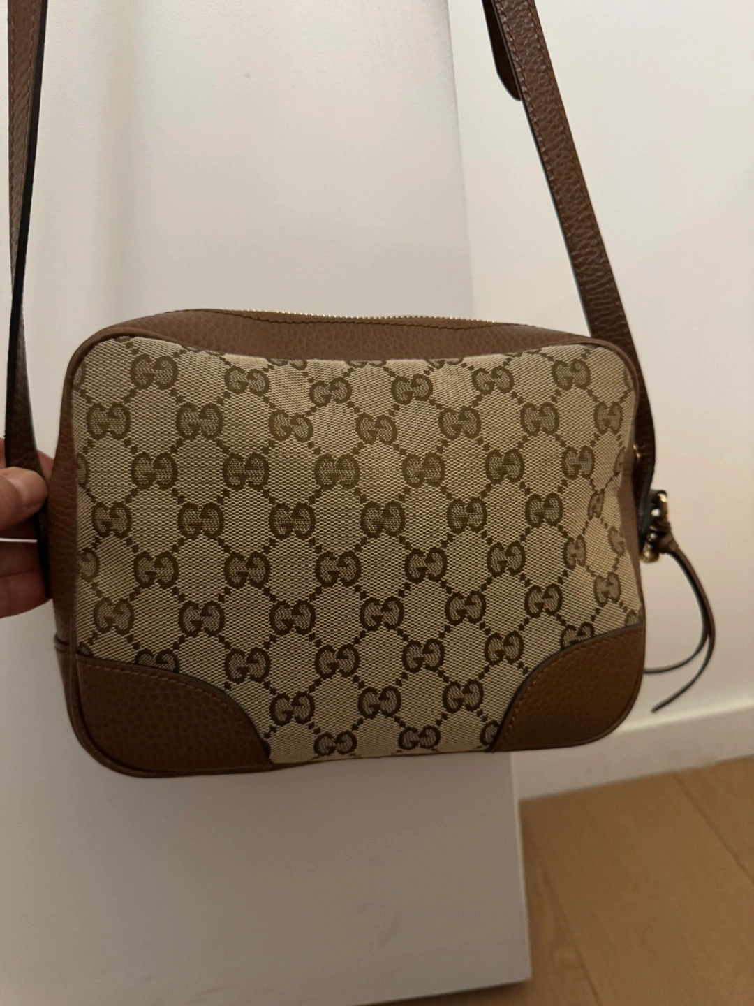 Small brown Authentic Gucci Bree, GG Supreme Canvas crossbody bag with adjustable strap.