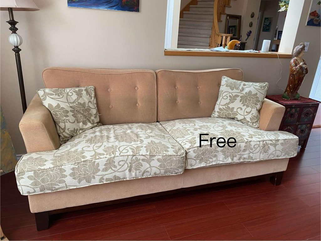 Beige couch with floral pattern fabric. Two cushions included. Wood legs.