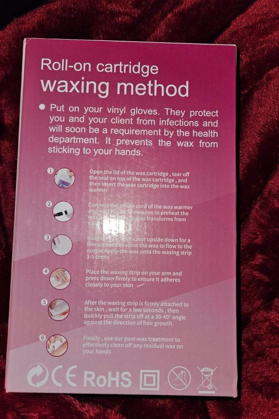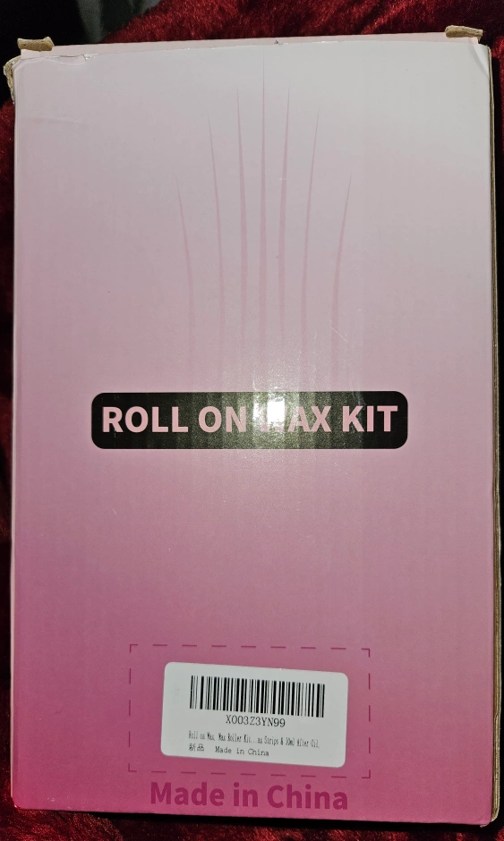 Roll-on wax kit with strips and wax heater. Includes instructions. Made in China.