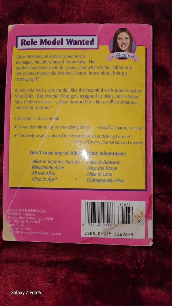 Paperback book. An Alice book. Aladdin Paperbacks. Simon & Schuster. Cover illustration copyright 1997, 1999 by Katherine Janus. Ages 9-13. Printed in the USA. #Freecycle