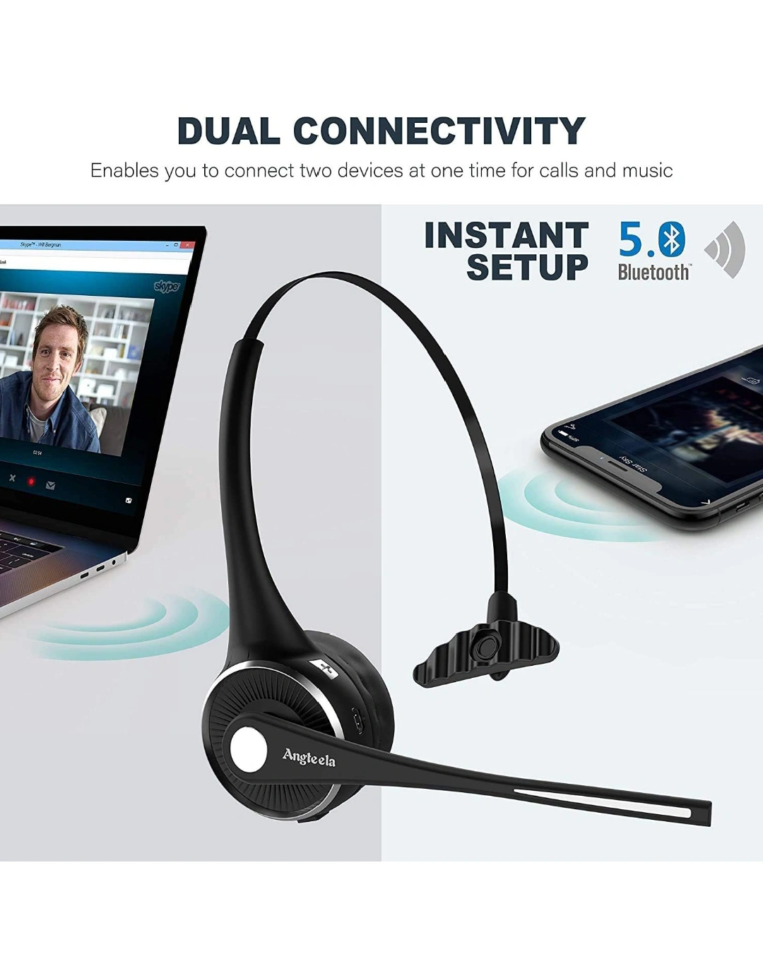 Trucker Bluetooth Angteela Headset with Microphone, Wireless Cell Phone Headset with Noise Canceling Mic Charging Base Mute Function for Home Office Call Center Skype.
