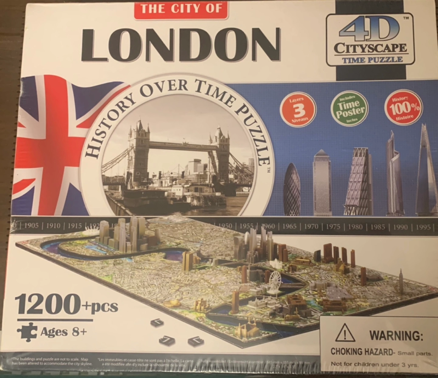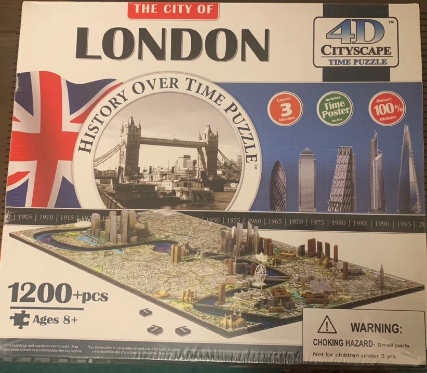 1200+ piece puzzle featuring London over time. Includes 3 layers, a time poster, and a 100% history feature. Ages 8+