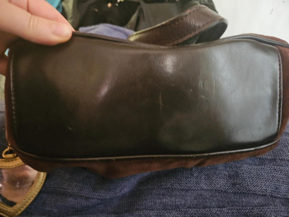 Y2K vintage Brown velvet handbag with gold accents. Has a small mirror charm and a gold pocket inside.