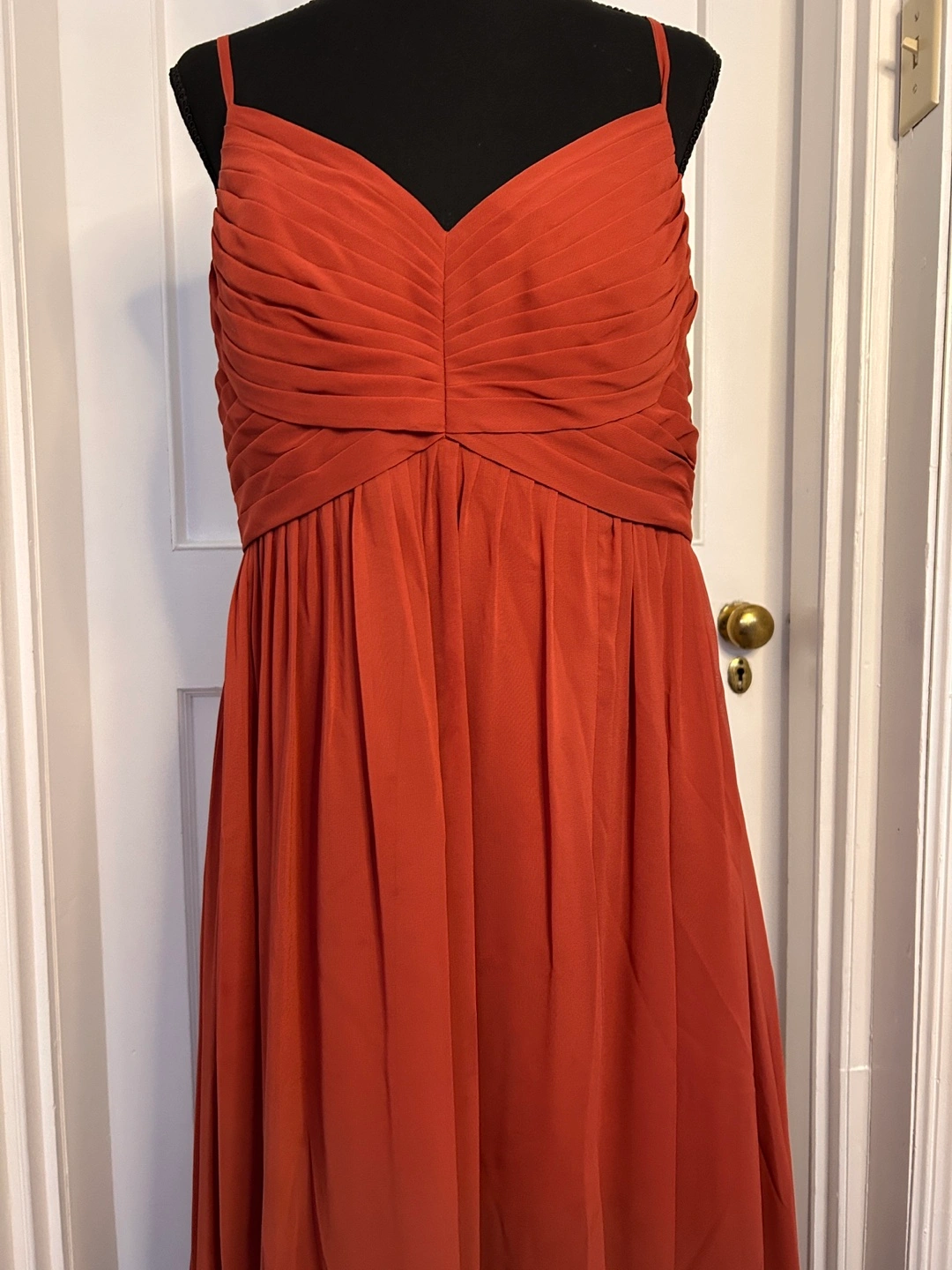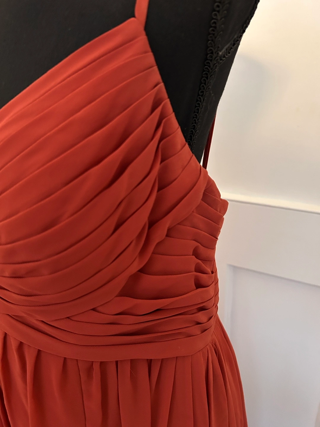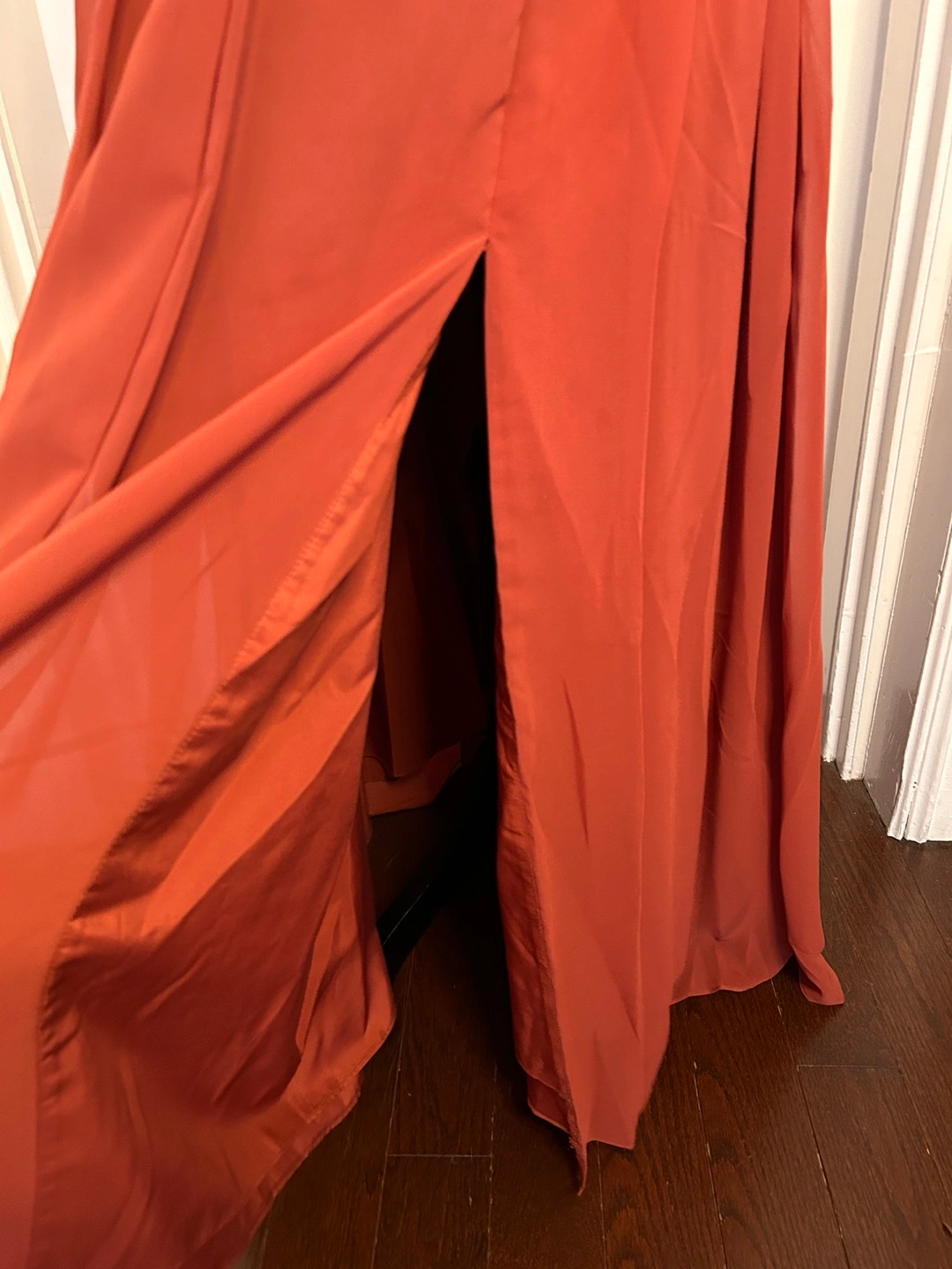 Beautiful rust orange maxi dress with a v-neckline and spaghetti straps. The dress is made of a flowy chiffon fabric and has a high slit on one side. It is fully lined. Retailed for $159 plus taxes. Pick up near High Park/Roncesvalles