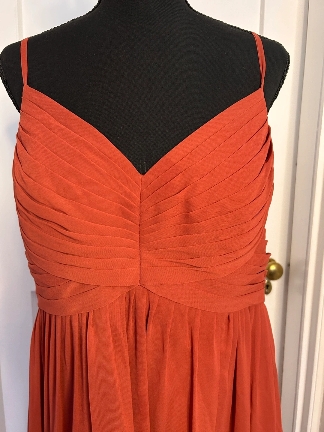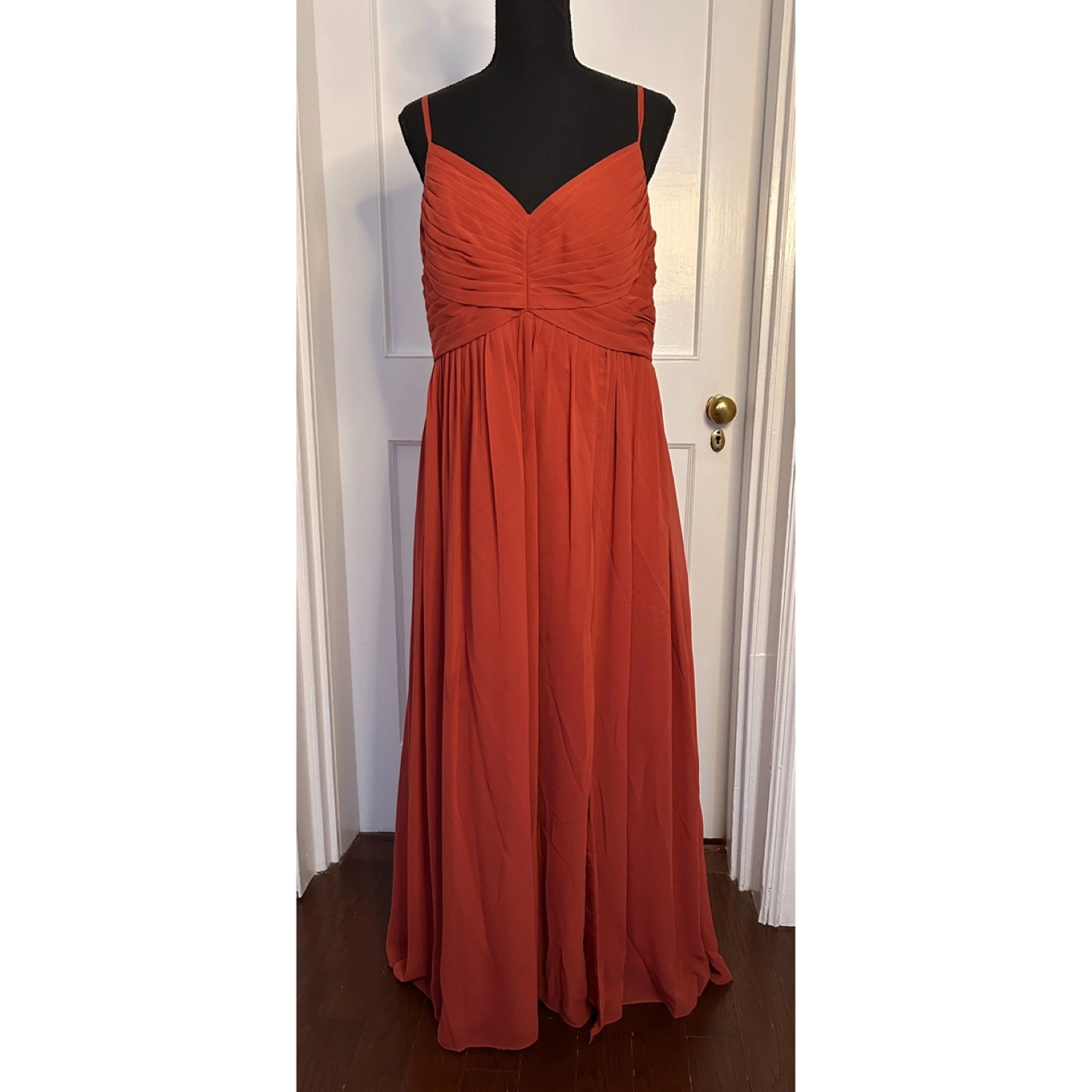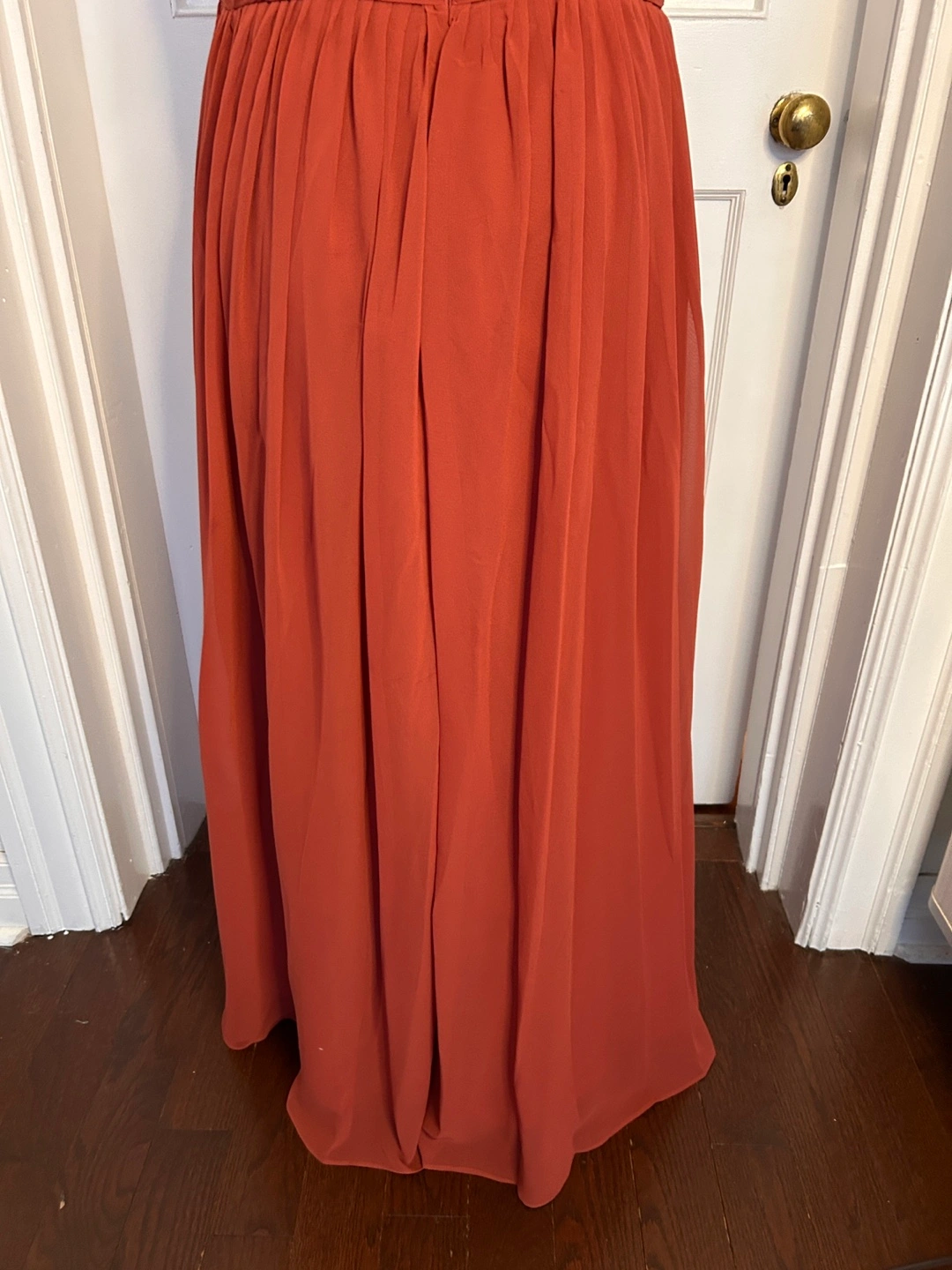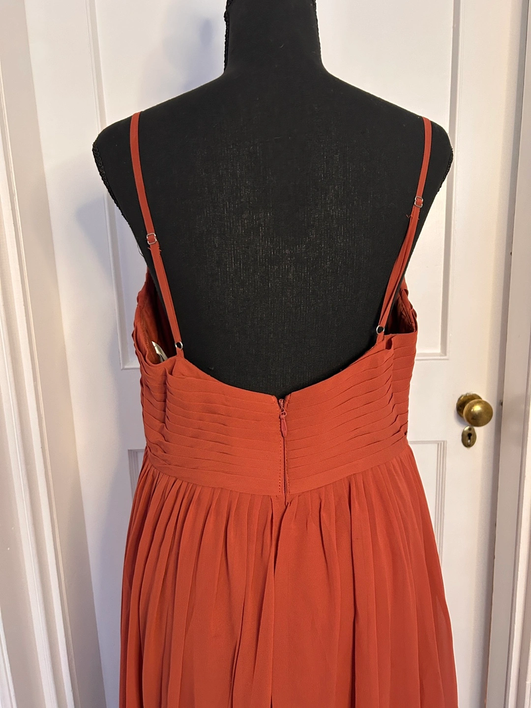 Beautiful rust orange maxi dress with a v-neckline and spaghetti straps. The dress is made of a flowy chiffon fabric and has a high slit on one side. It is fully lined. Retailed for $159 plus taxes. Pick up near High Park/Roncesvalles