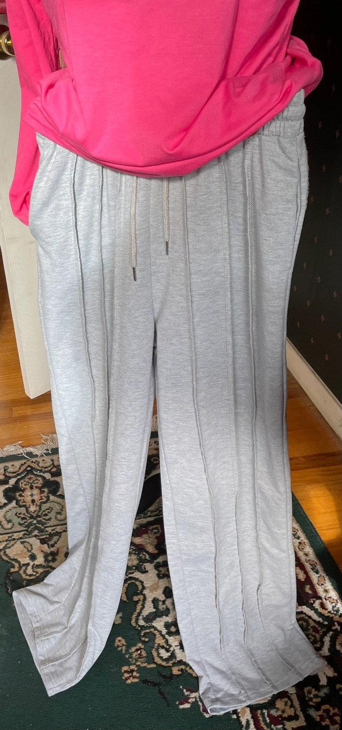 #ThriftyPicks Grey sweatpants with pleated detail in the front. Drawstring waistband. Two side pockets. Slight flare to the bottom. Never worn.