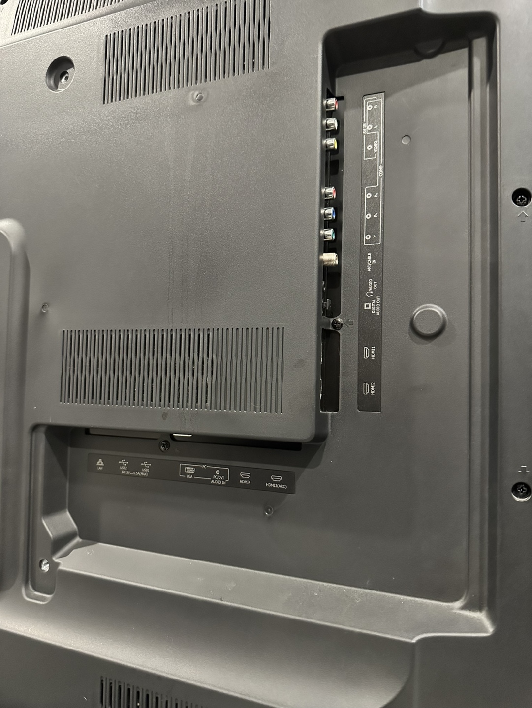 -Connections: HDMI Input x 3, USB x 2, RF Input, RCA Composite Video Input (shared with component), L/R Audio Input for Composite (shared with component), RCA Component Video Input, L/R Audio input for Component, VGA Input, Audio Input for VGA, Digital Audio Output (Optical), Earphone/Audio Output, LAN.