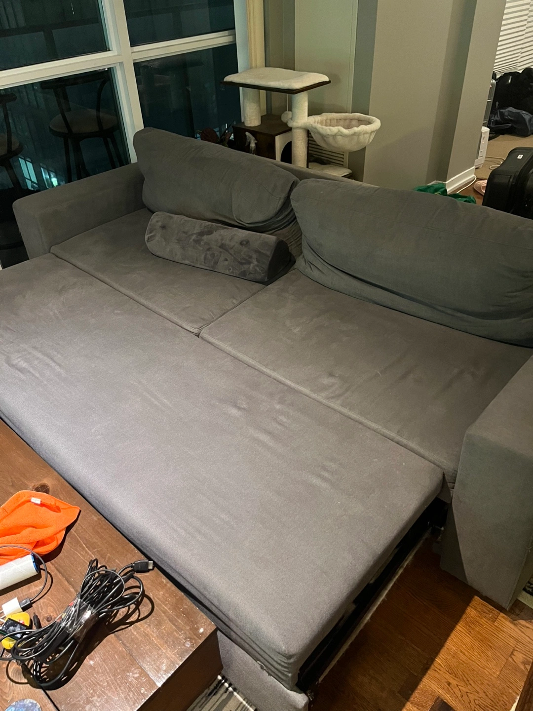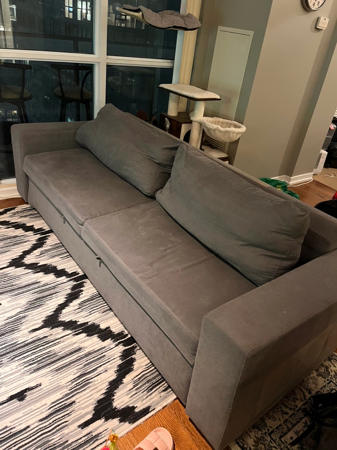 Bought this grey pull out couch two years ago for $1500 and we need to sell it because we bought another for the new place we are moving to tomorrow! $80 or best offer - MUST BE PICKED UP ON FRIDAY DEC 6 because we have booked the service elevator for that time so you can use it to transport it.