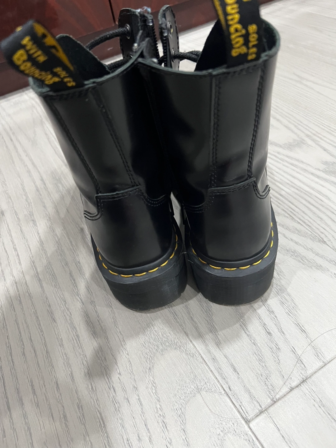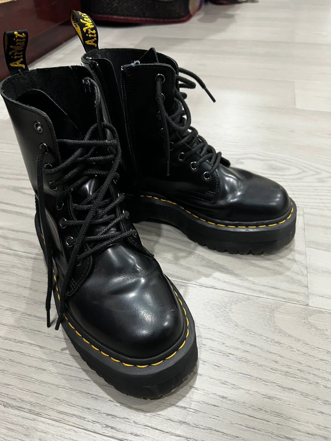 Black leather platform boots with a side zipper. Lace-up style with yellow stitching.