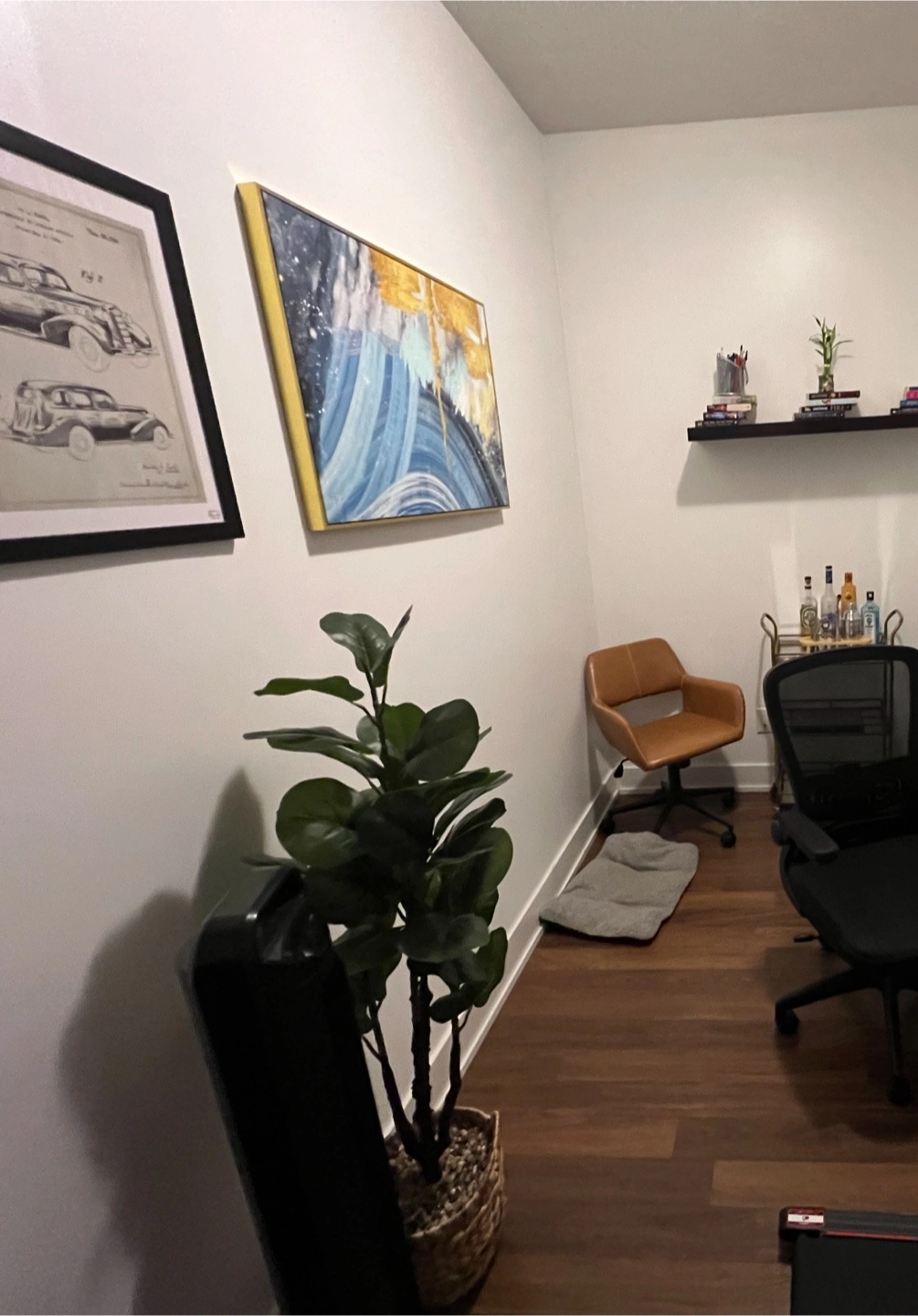 Looking to add a splash of colour to your home? This abstract art painting could be just the thing! The painting features an array of colours, including blues, golds, and whites. It's framed and ready to hang, making it super easy to incorporate into your existing decor