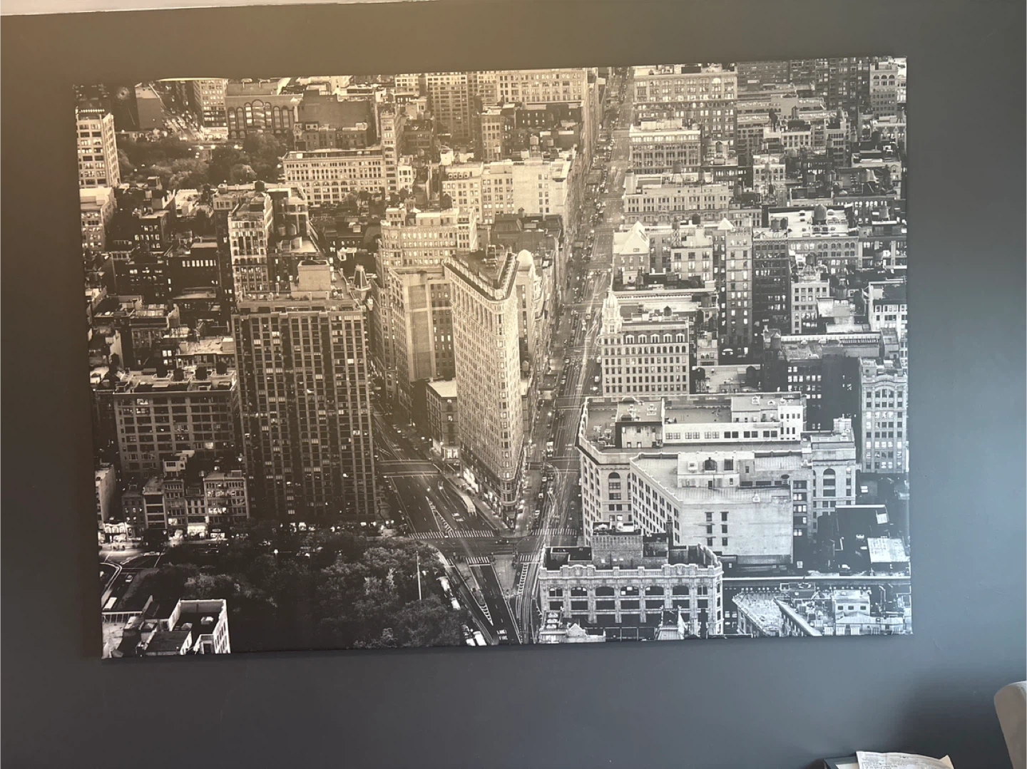 This large canvas print showcases a black and white aerial view of the New York City skyline, featuring the iconic Flatiron Building. It's a striking piece of wall decor for any urban enthusiast. The artwork is printed on canvas with a matte finish.