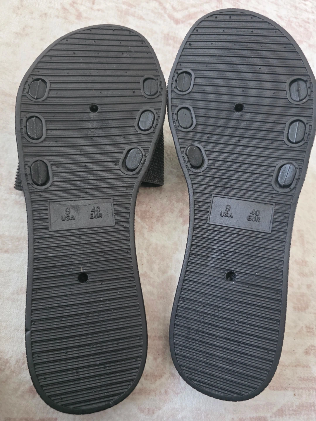 These LOVE83 slide sandals come in a classic black color with a sparkle detail on the strap. They're a size 9 in US Women's sizing, which is equivalent to a size 40 in European sizing. The sole has a textured grip for added traction.