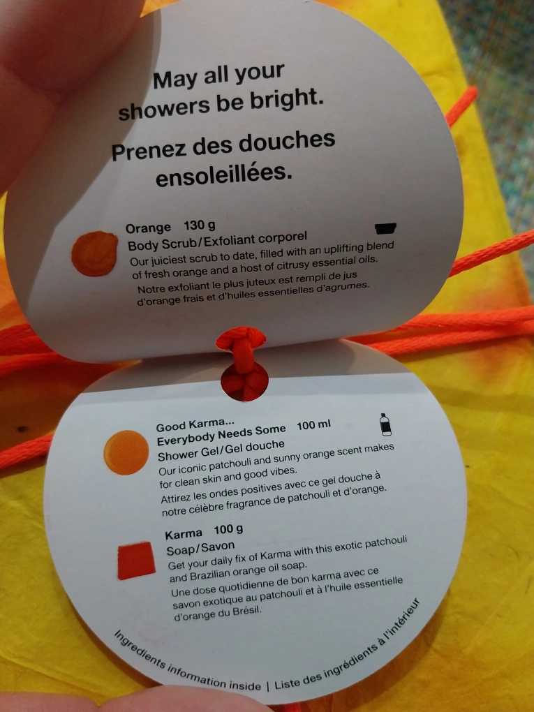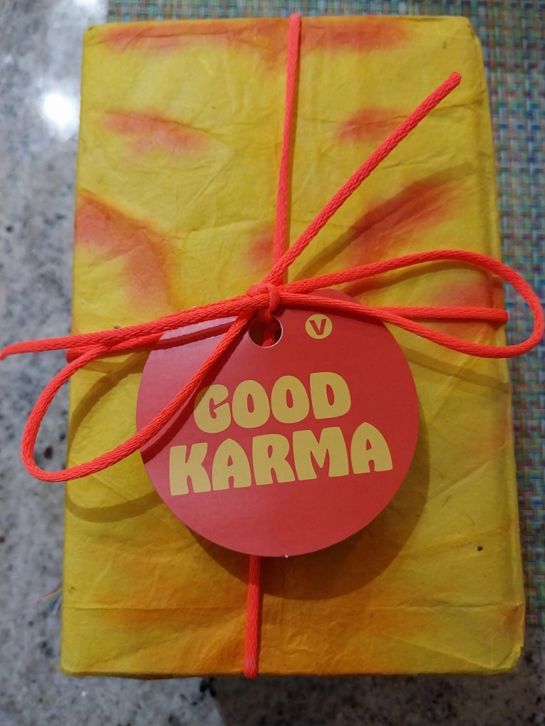 Good Karma shower gel and Karma soap. Both are new and unused. Wrapped in Lush wrapping paper with a red ribbon.