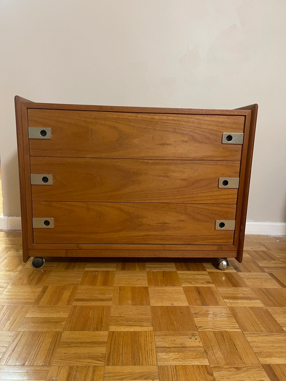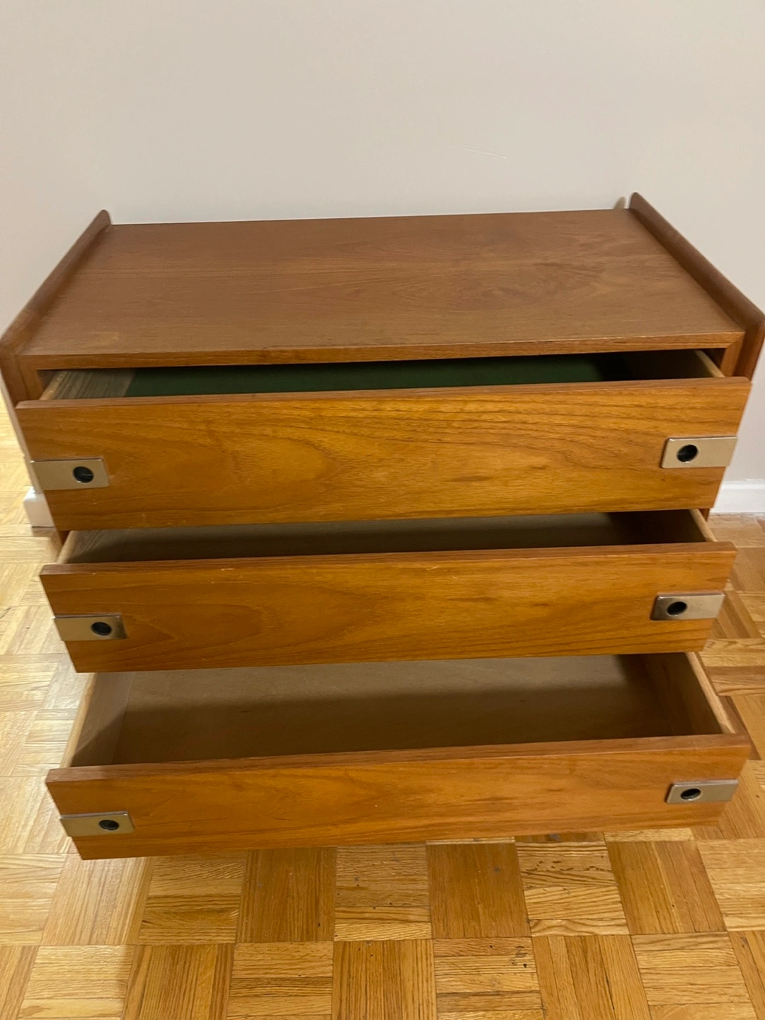 Four-drawer dresser with unique pull handles. Made of solid wood. Some minor wear and tear but in good condition.