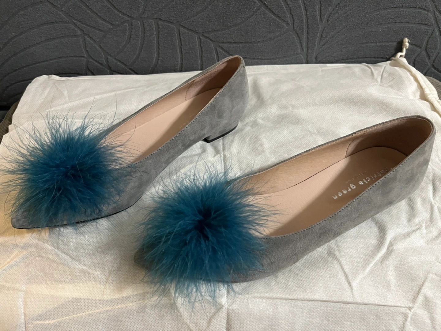 Grey suede Patricia Green flats with teal feather pom-poms. Size 8. Made in Spain.