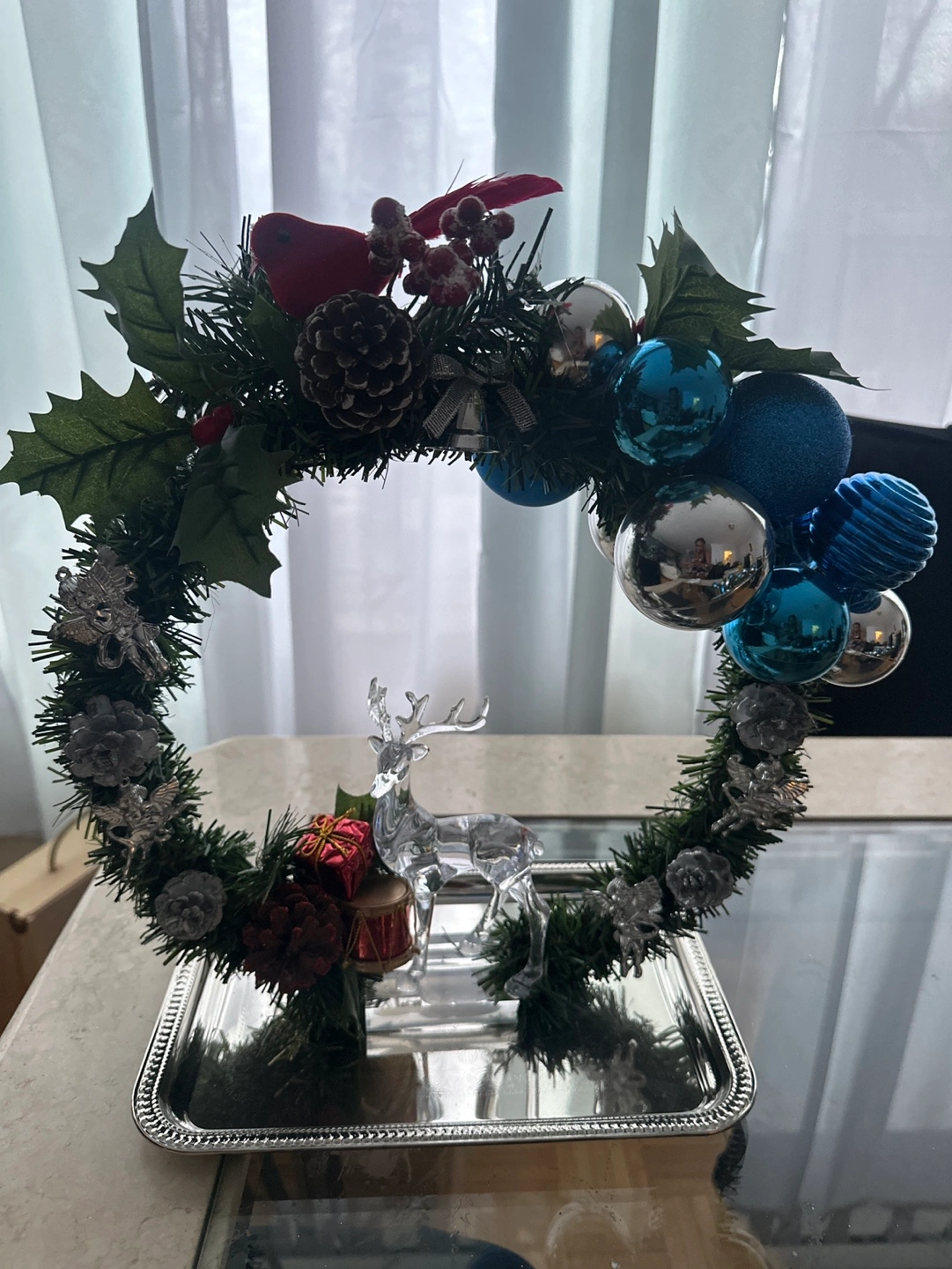 Hand made Christmas wreath with blue and silver ornaments, a red bird, a deer figurine, and a drum. It is sitting on a silver tray.
