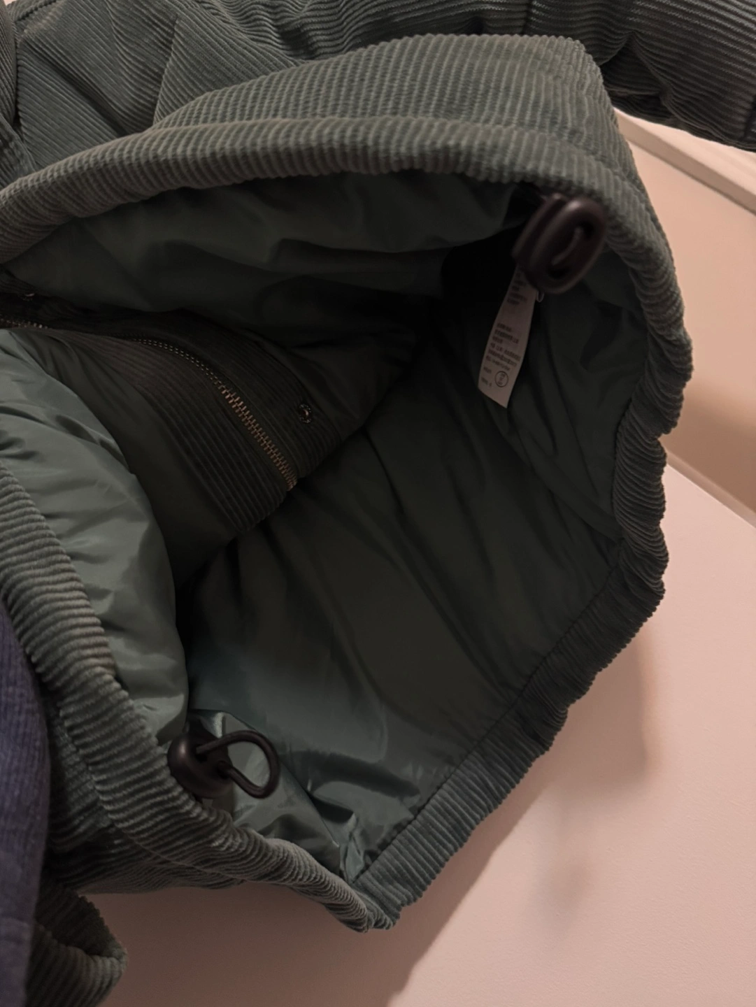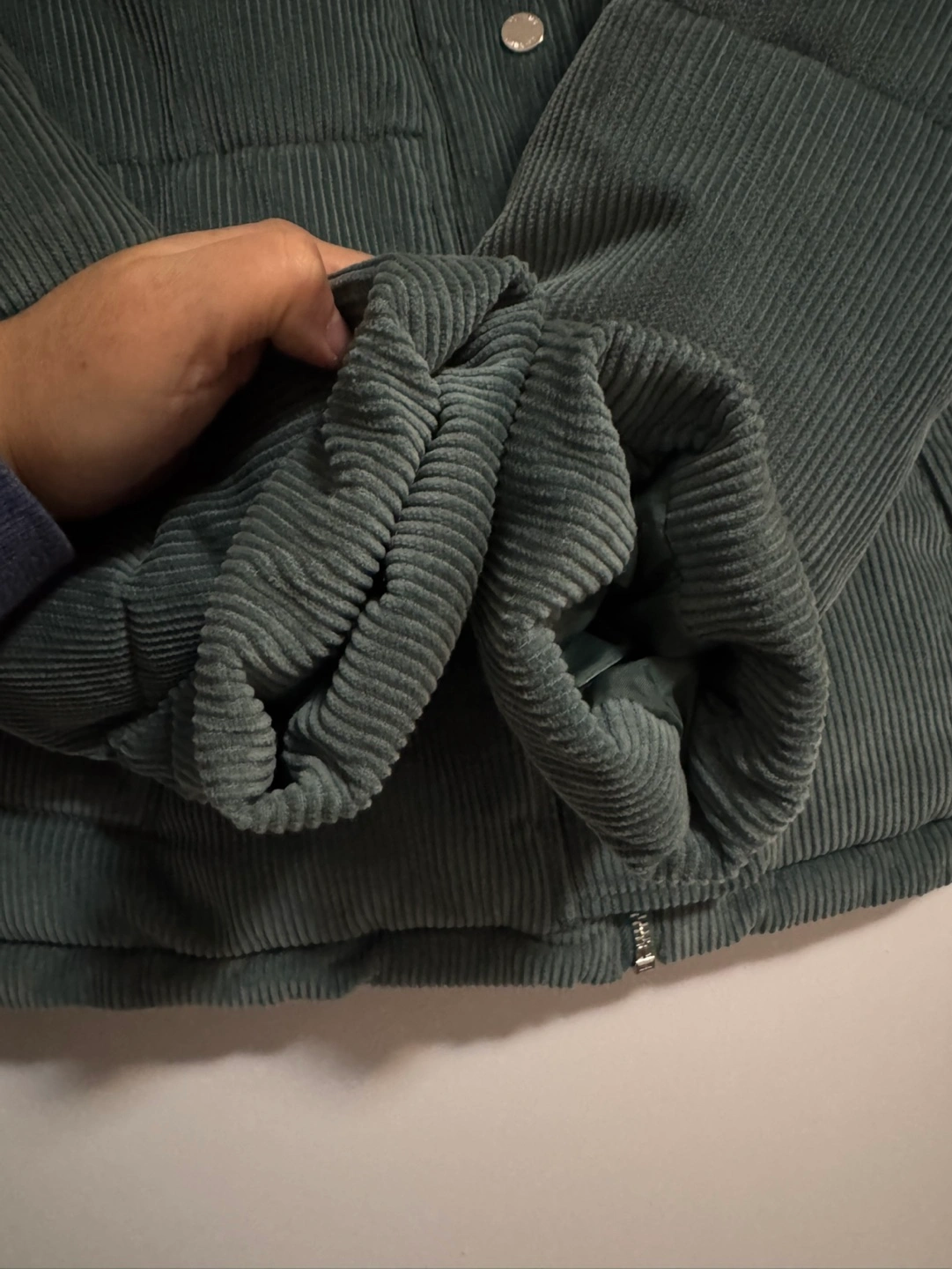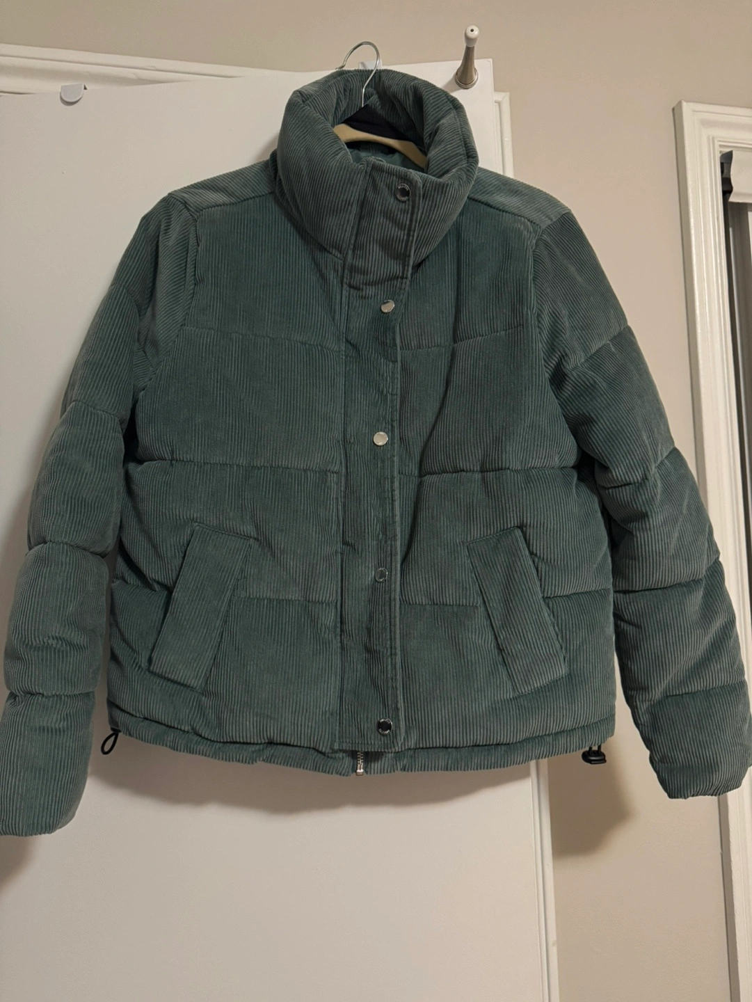 Green corduroy puffer jacket with a high neck, zipper closure, and pockets. It has a drawstring at the bottom and elastic cuffs.