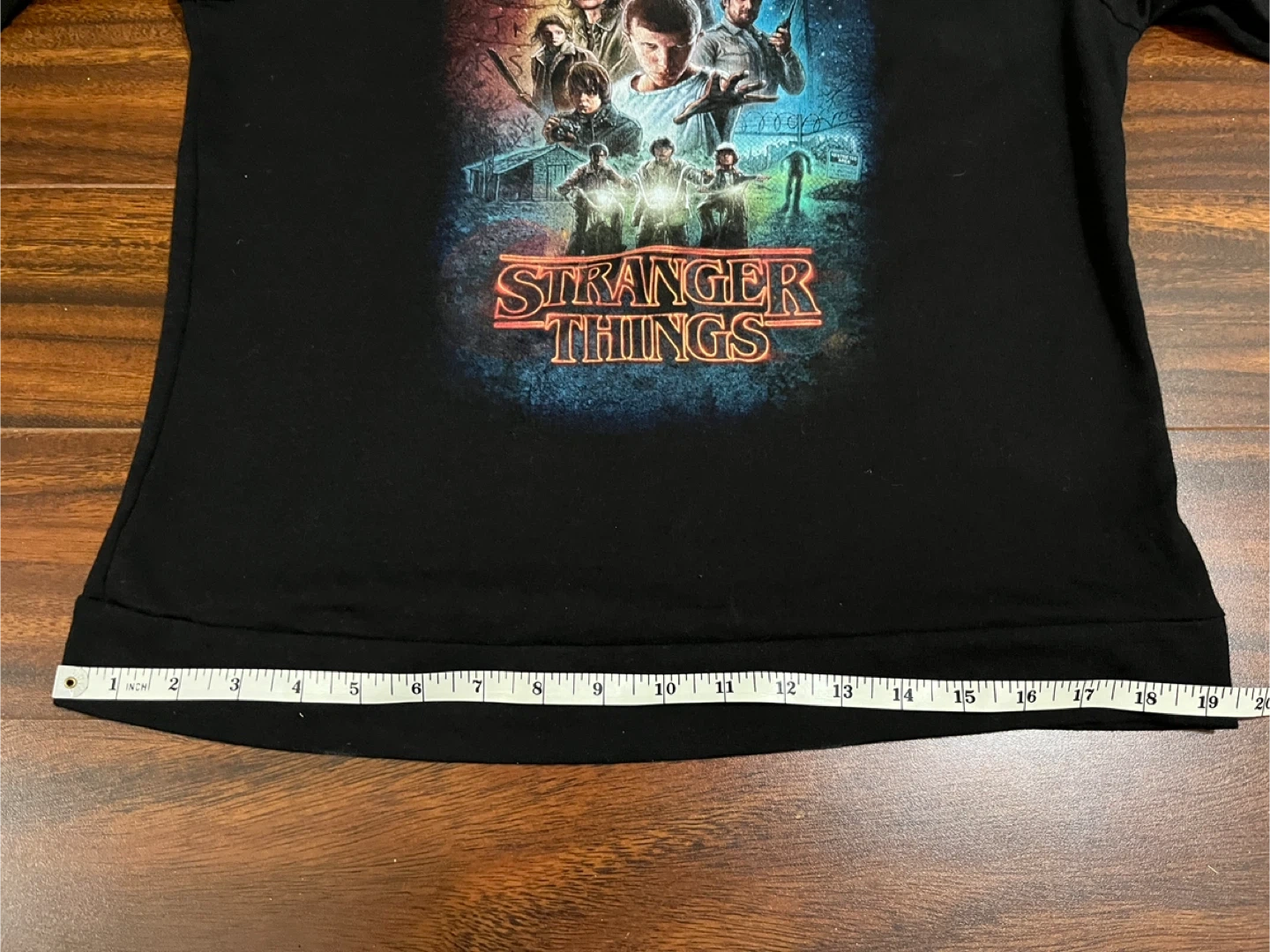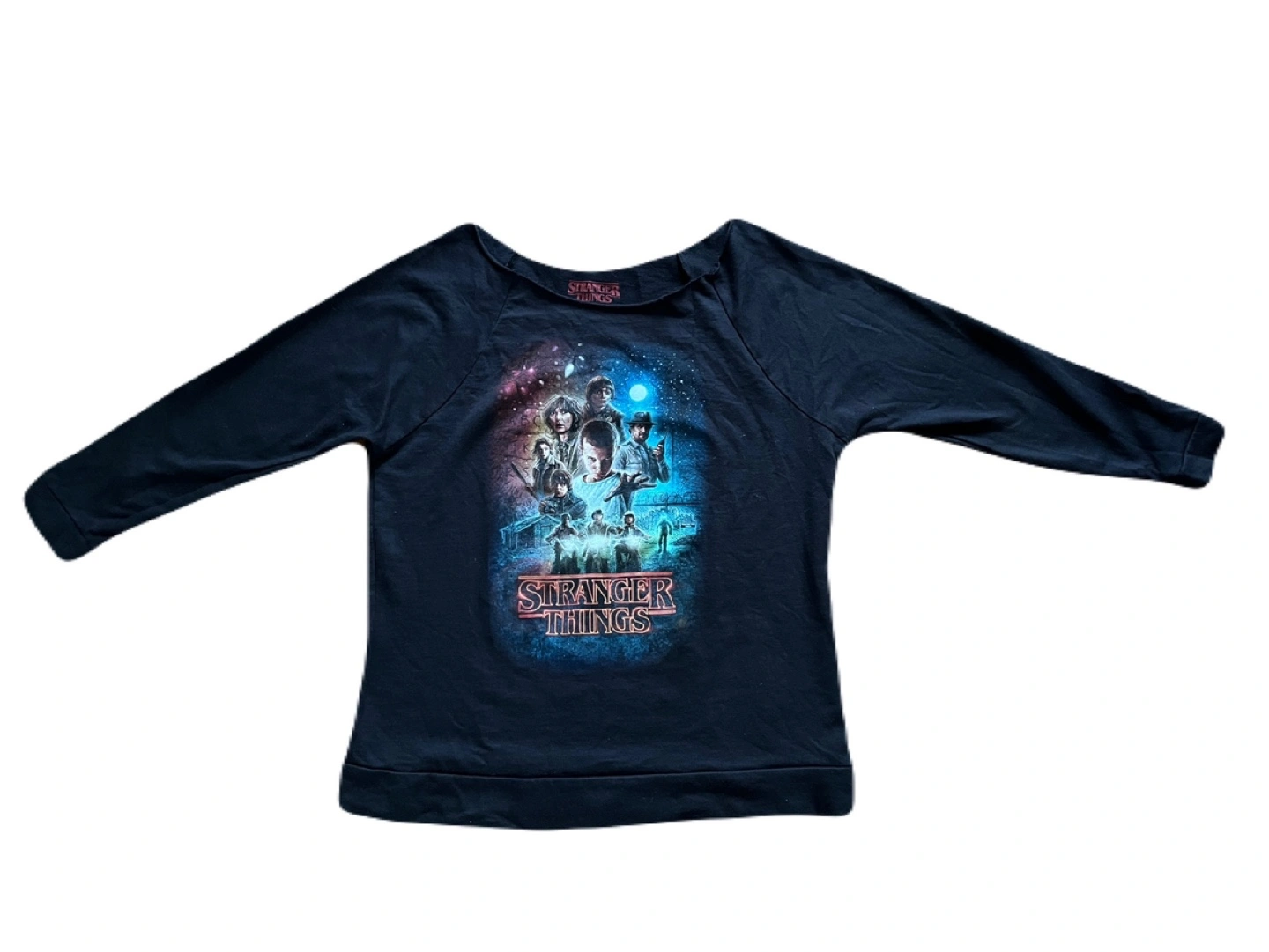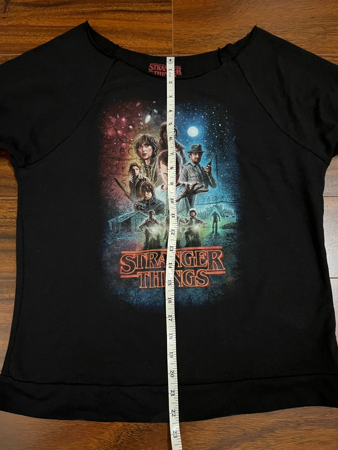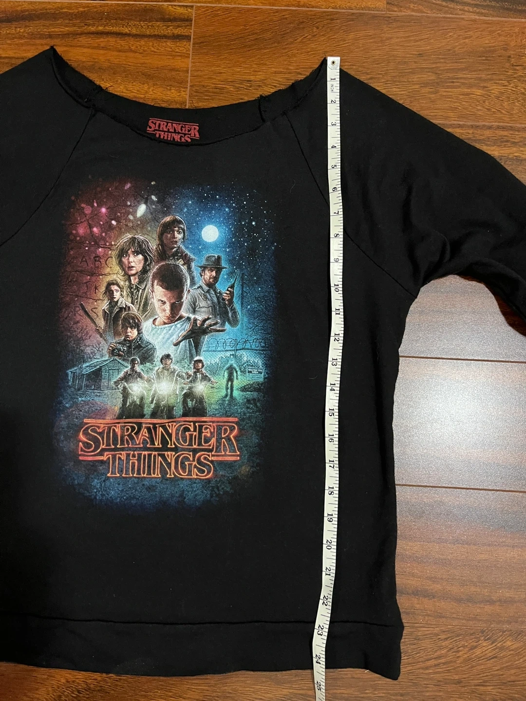 Stranger Things long sleeve knit top for women, size large. Black with Season 1 graphic print. Great condition. Lightweight knit that is thicker than a t-shirt and thinner than a sweatshirt. Raw edge neckline, relaxed cut and dolman-style sleeves.