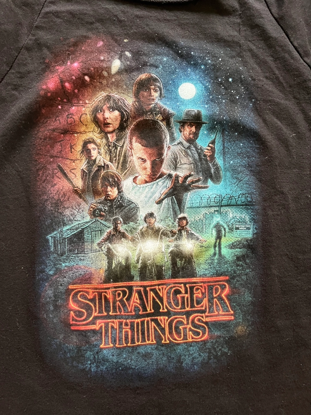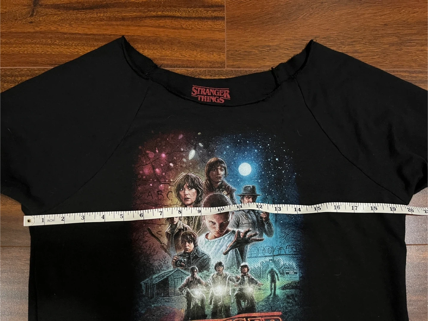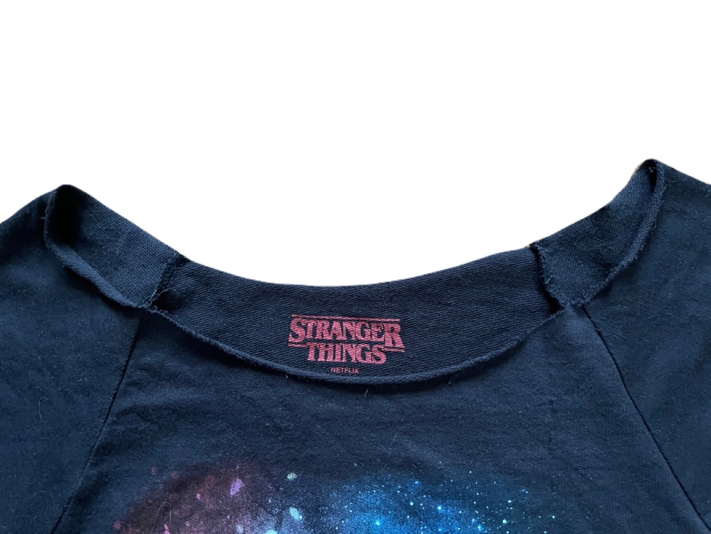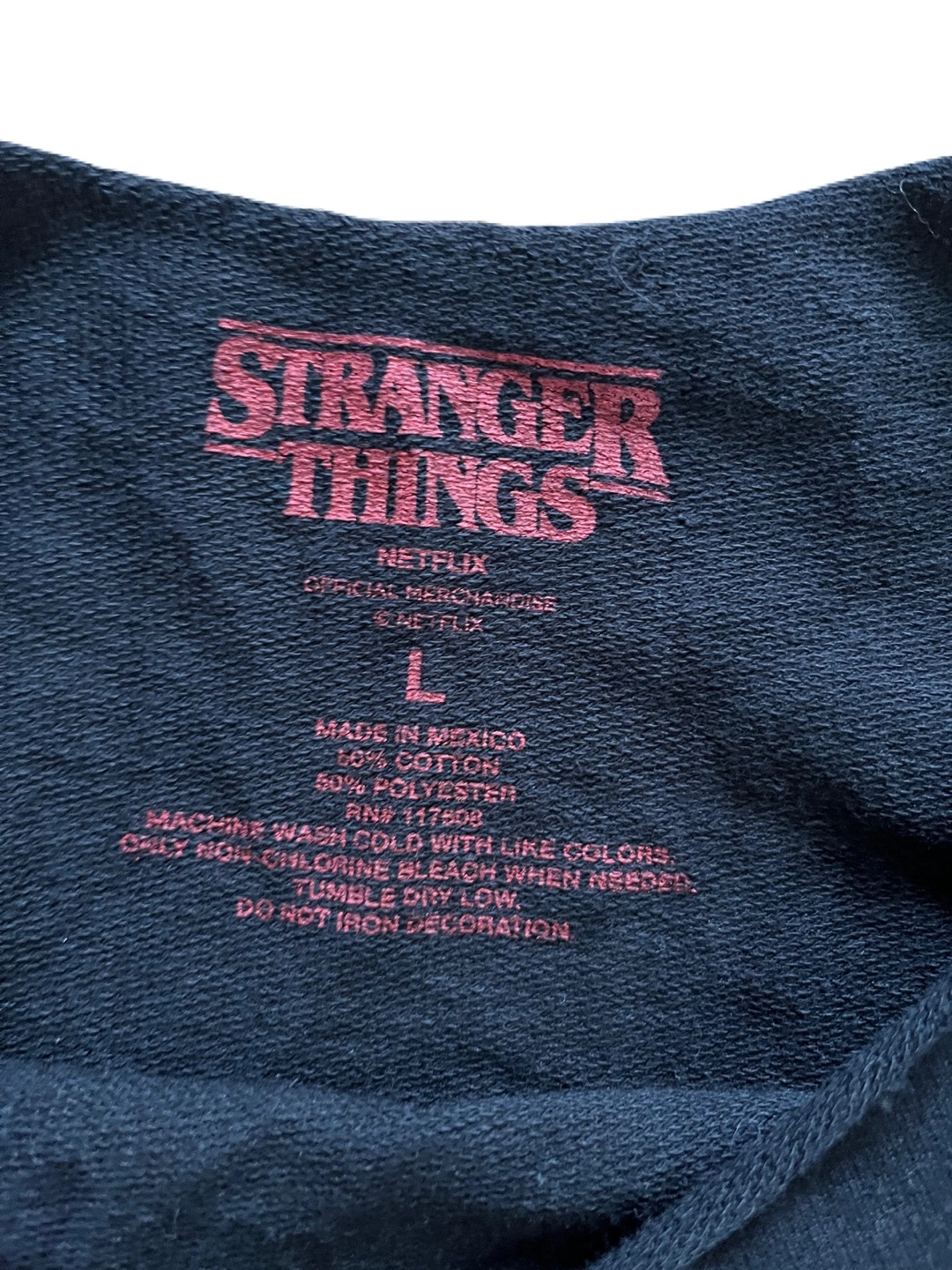 Stranger Things long sleeve knit top for women, size large. Black with Season 1 graphic print. Great condition. Lightweight knit that is thicker than a t-shirt and thinner than a sweatshirt. Raw edge neckline, relaxed cut and dolman-style sleeves.