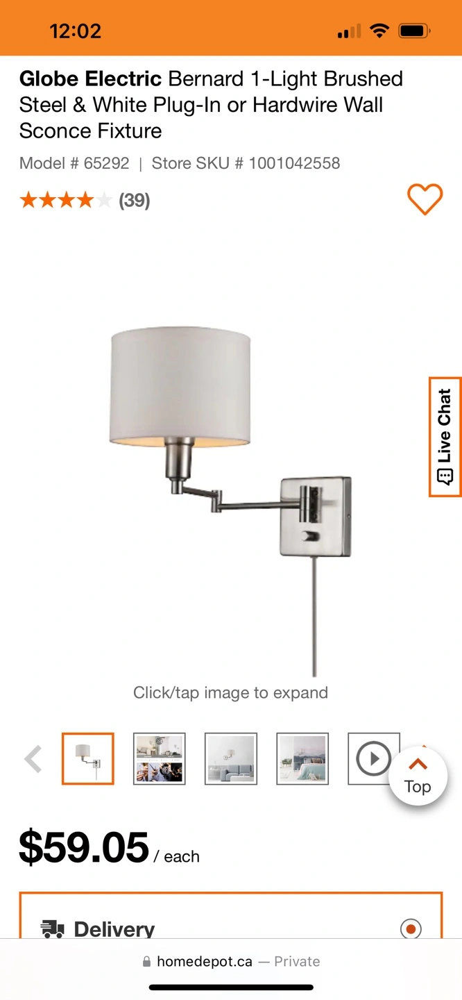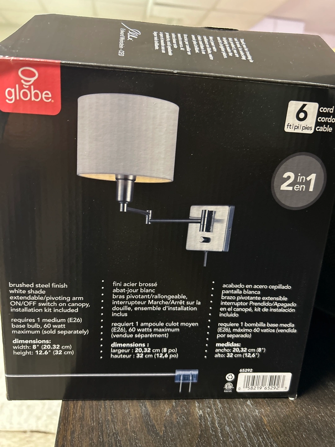 NEW. Never used. Very nice brushed steel finish, white shade. Swiveling arm with ON/OFF switch on canopy. Requires 1 medium (E26) maximum 60 watts bulb. Installation kit included separately. Dimensions: width: 8” (20.32 cm), height: 12.5” (32 cm).