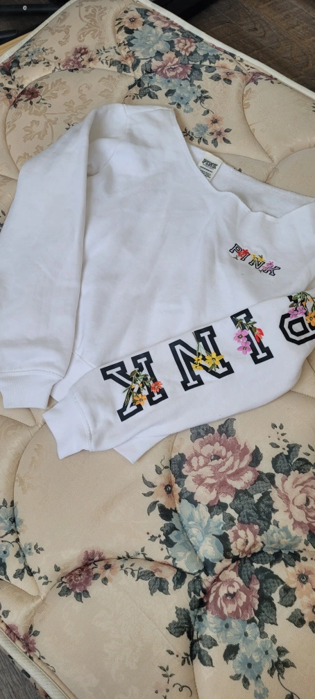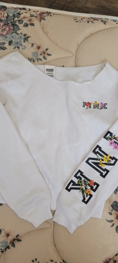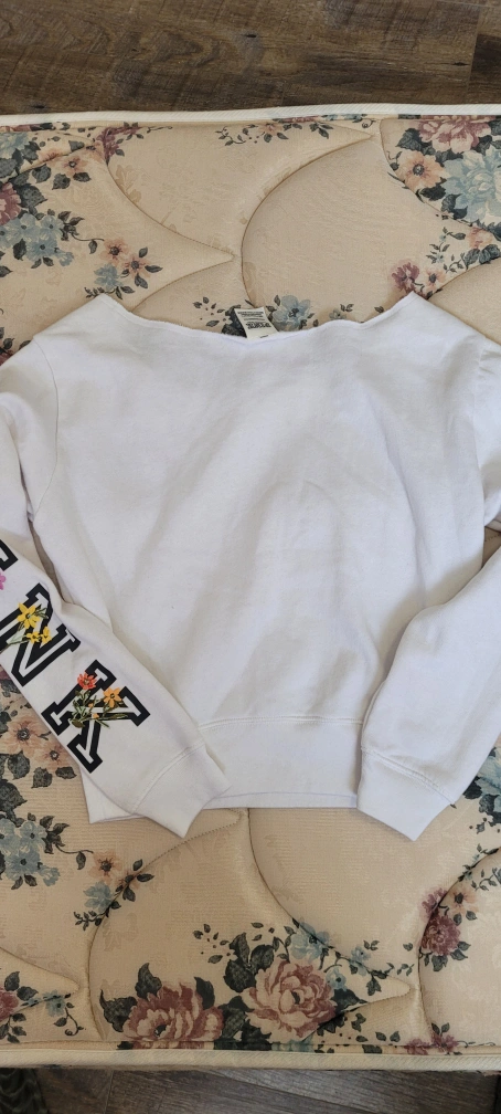 White cropped sweater with a floral design on the sleeve and small logo on the front. Long sleeves. Can deliver within London for 5 CAD.