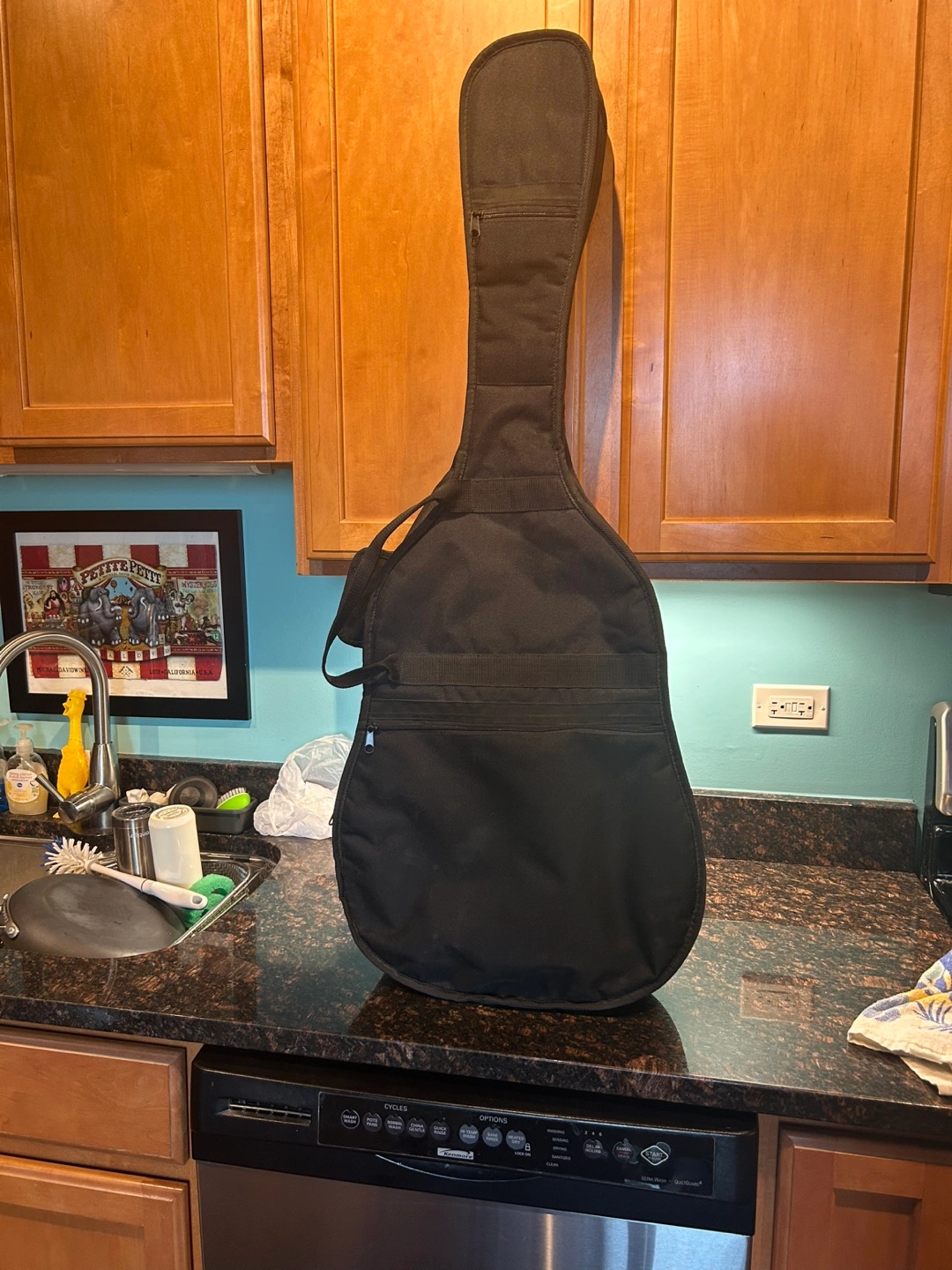 Black guitar gig bag with a large pocket. The bag has a zippered pocket on the top and a zippered pocket on the bottom. One shoulder strap. Hanging loop. All zippers work well, no rips no tears no stains. Inside dimensions 42 inches long, 16 inches across at widest.