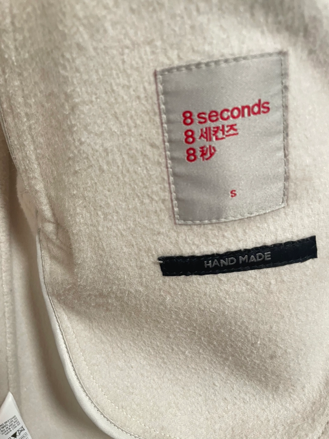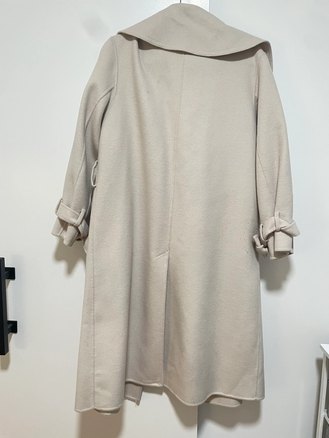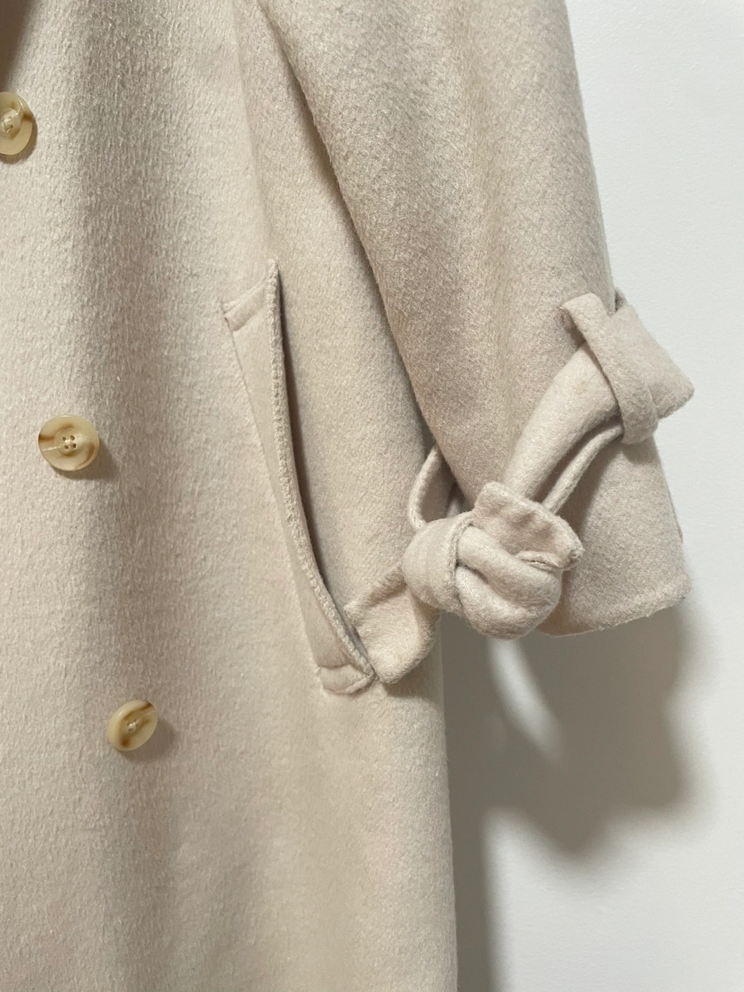Beige/Cream wool blend coat with a large collar, double-breasted closure, and a tied detail on the sleeves. Two large front pockets. Some pilling but overall in great condition.