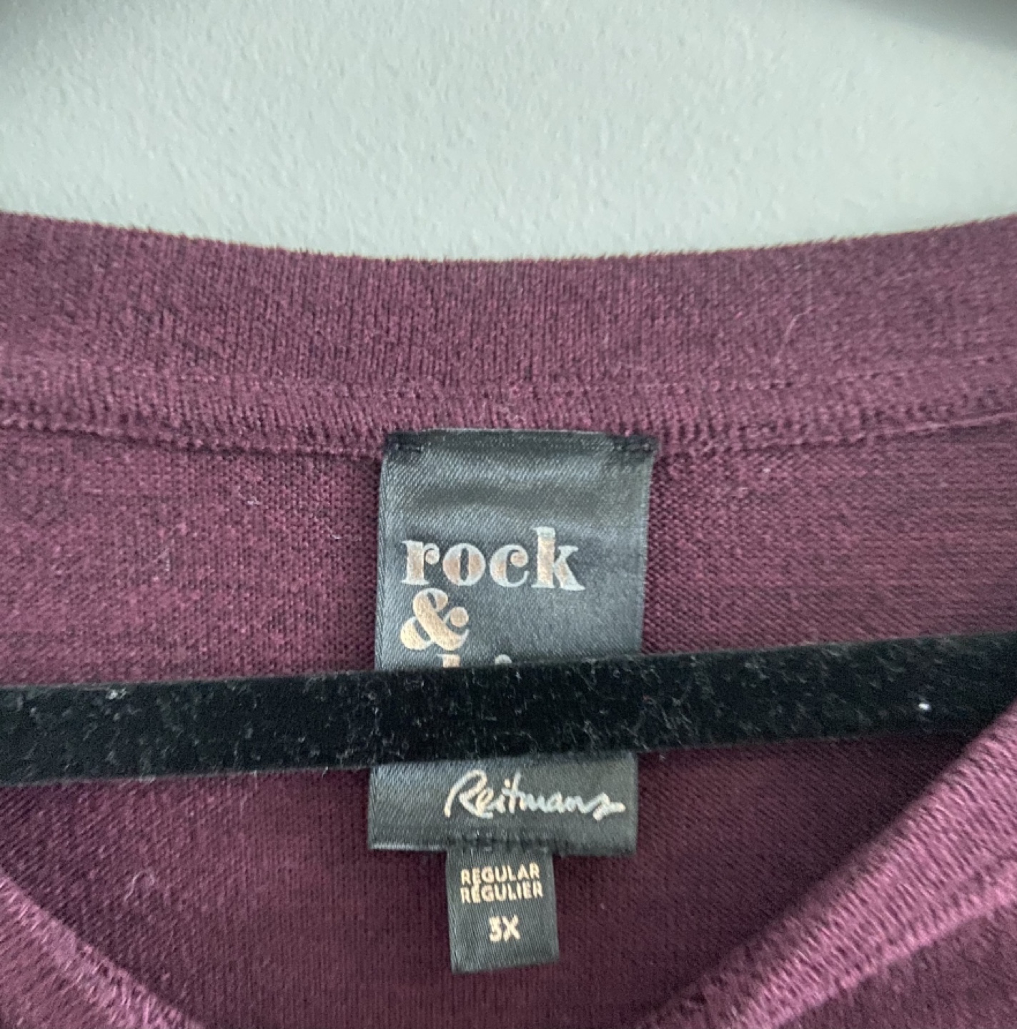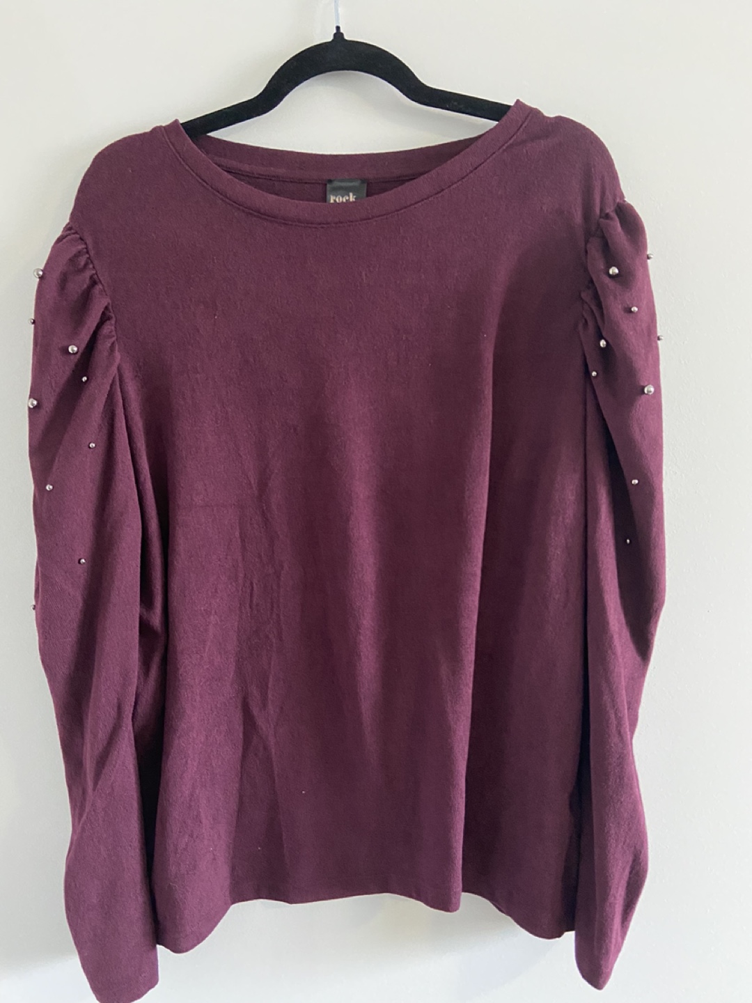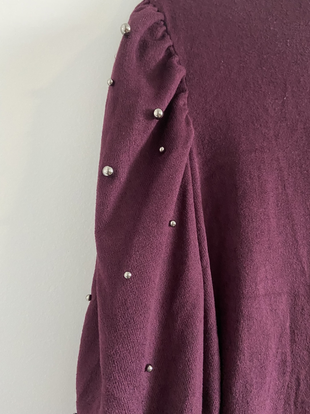 Long-sleeved, maroon sweater with silver embellishments on the shoulders. Size 3X, fits smaller