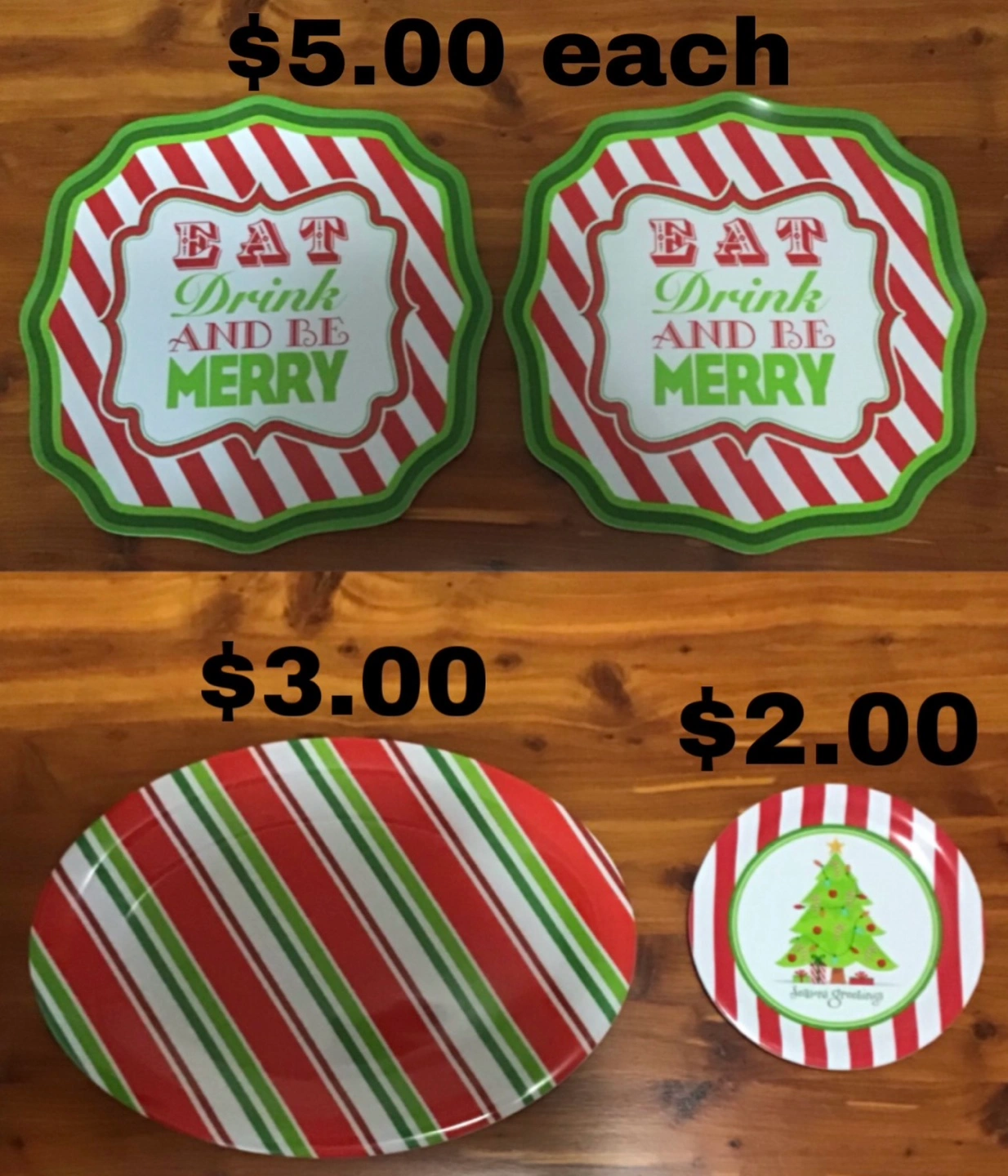 4 separate Christmas themed serving trays and plate. Two large trays, one oval tray, and one small plate. All items are in good condition.