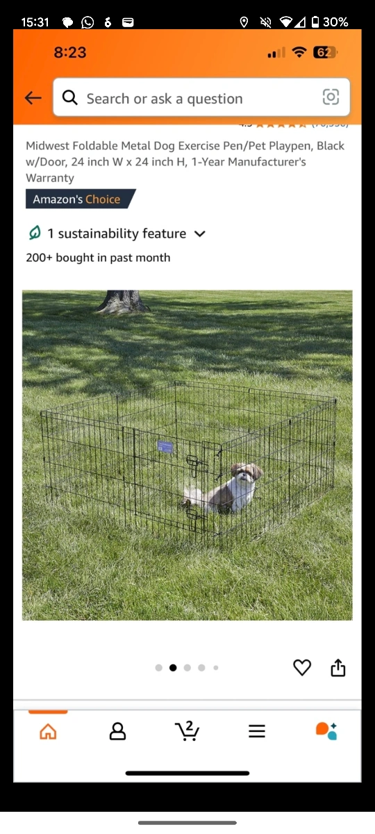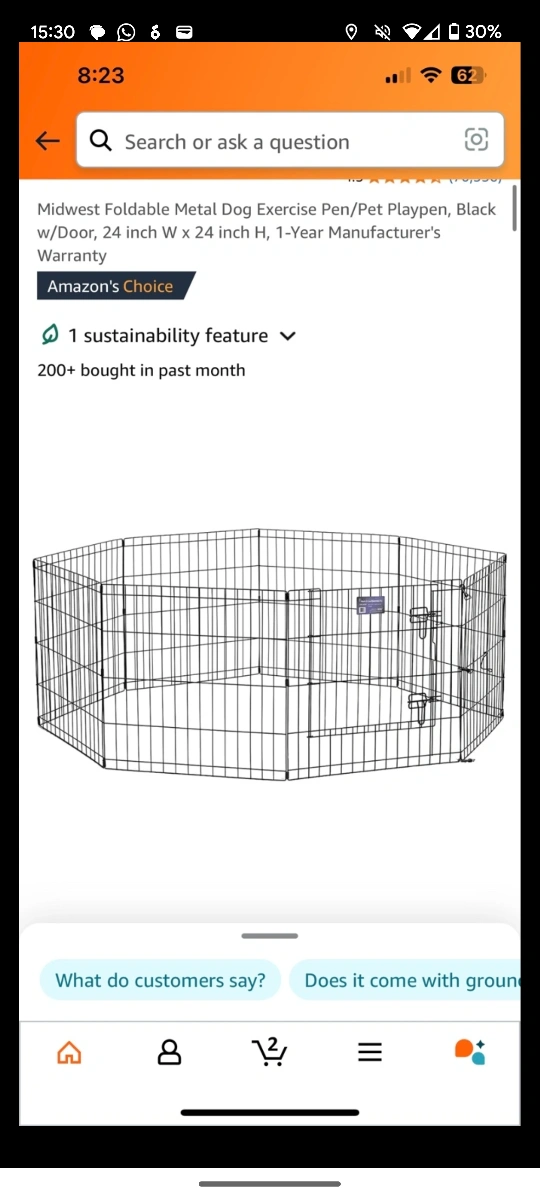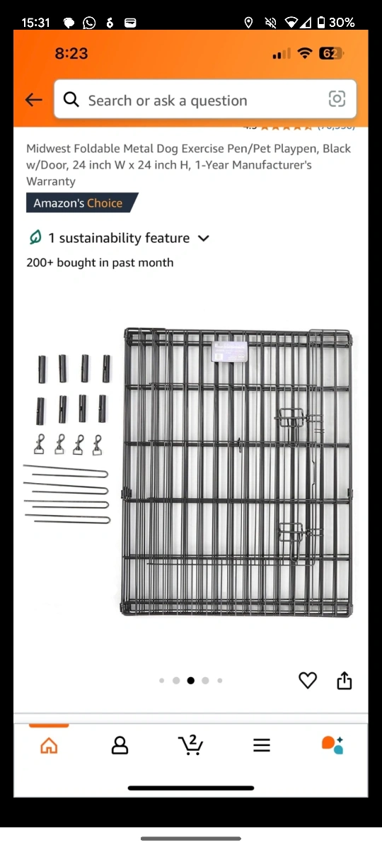 Foldable metal dog exercise pen with door. Black colour. Each panel is 24 inches wide by 24 inches tall. 8 panels