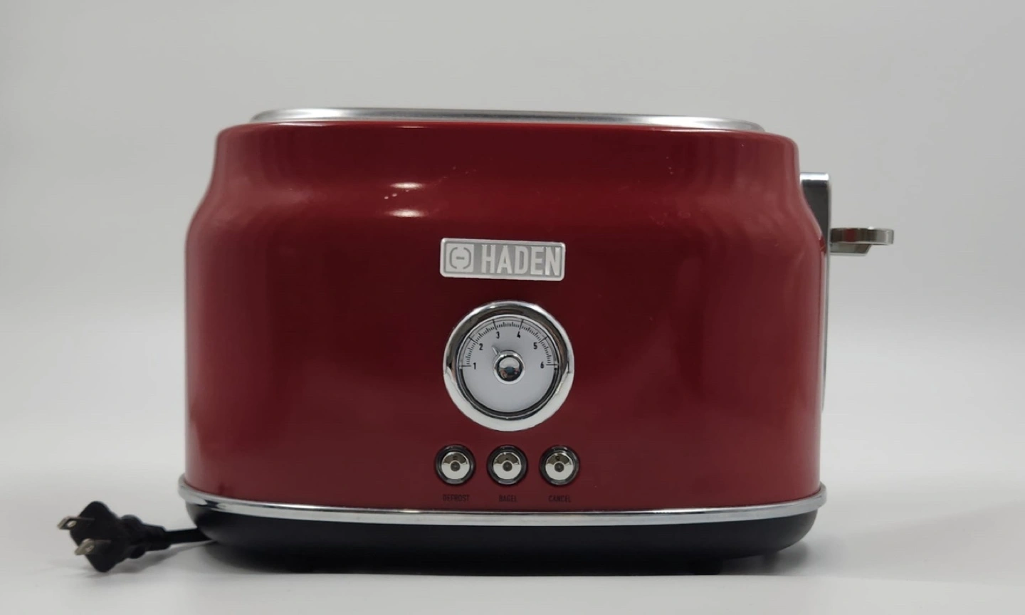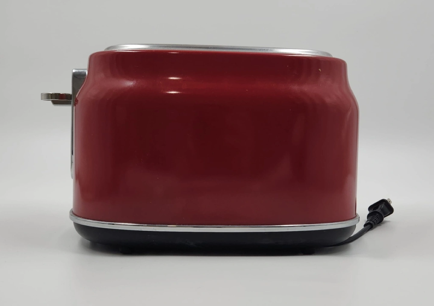Red kettle and toaster set. Both have a vintage look with chrome accents. Kettle has a thermometer, and toaster has multiple settings and a crumb tray.