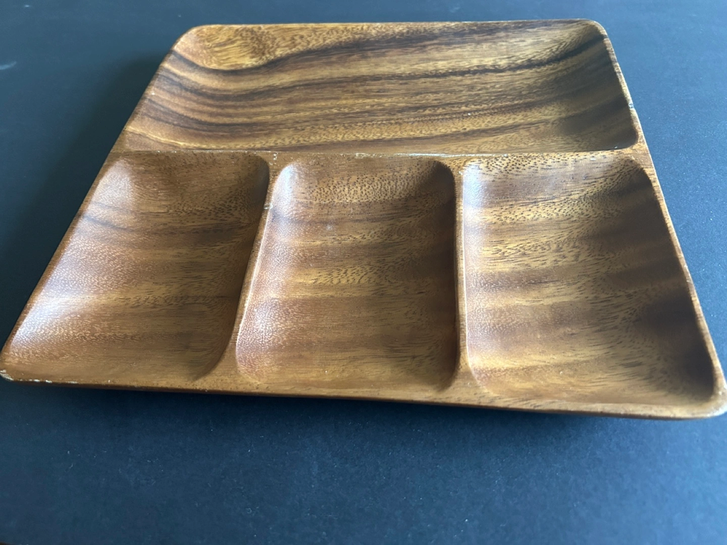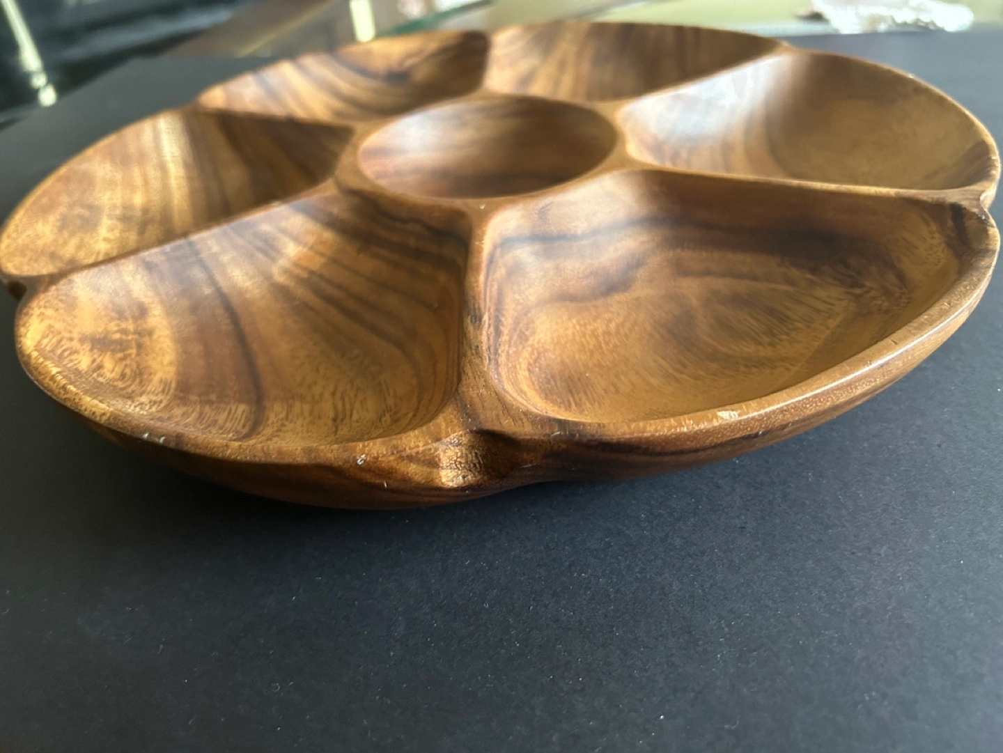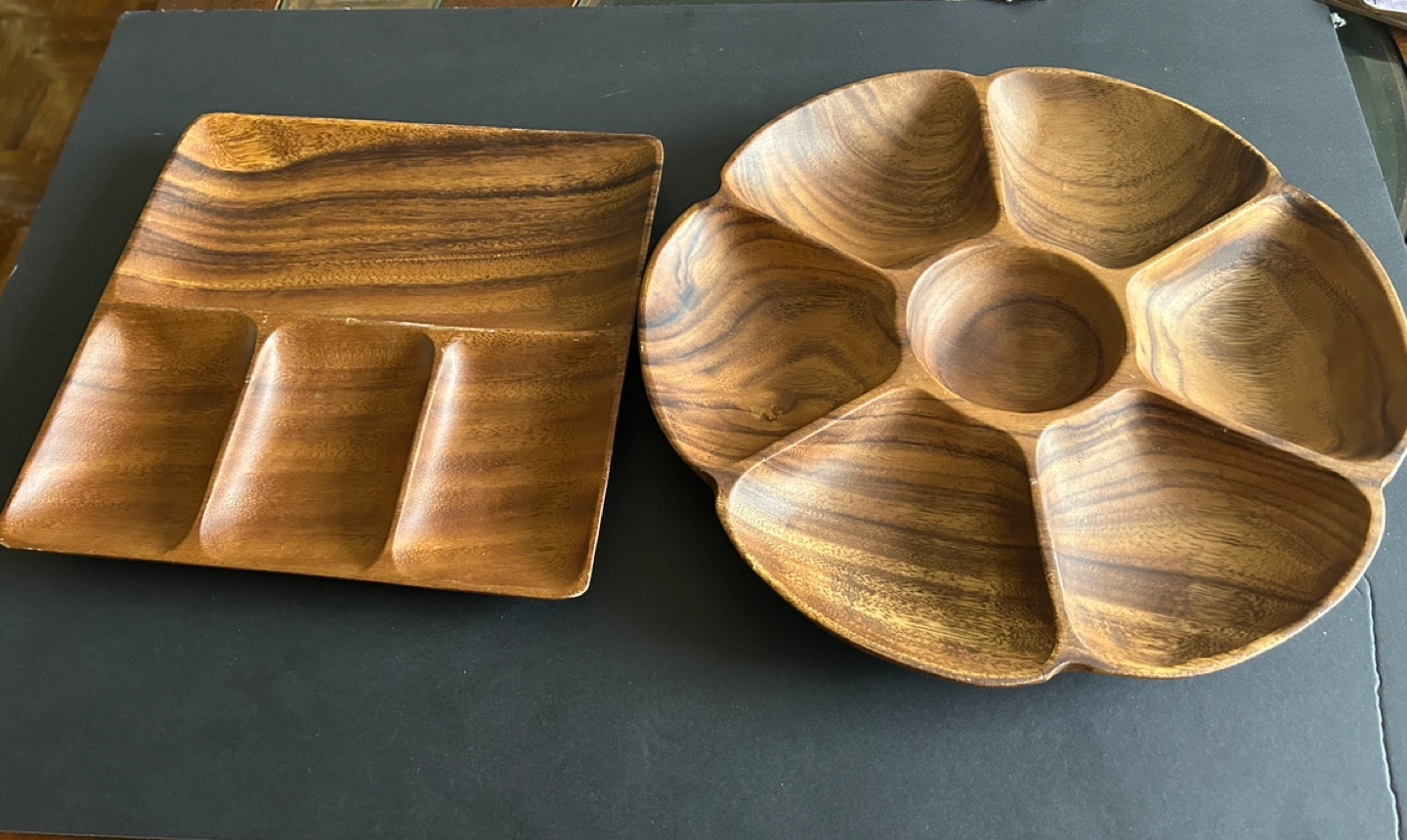 Set of two wooden serving trays, one square and one round. The square tray has four sections and the round tray has six sections. They are both made of wood.