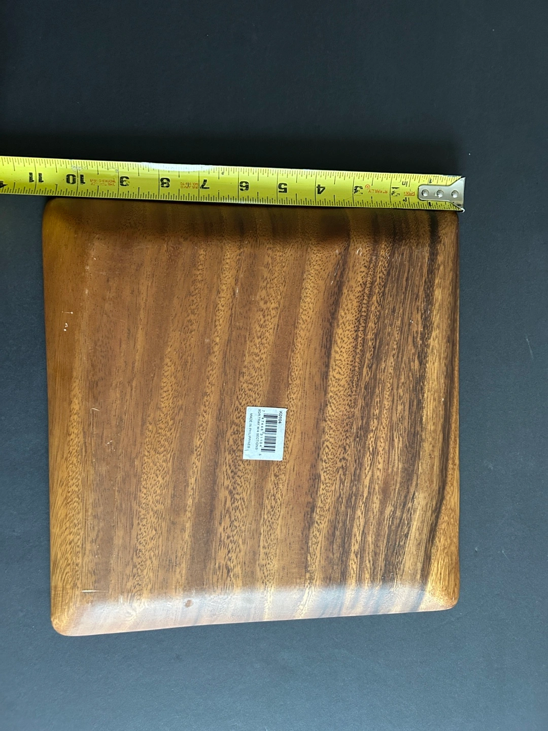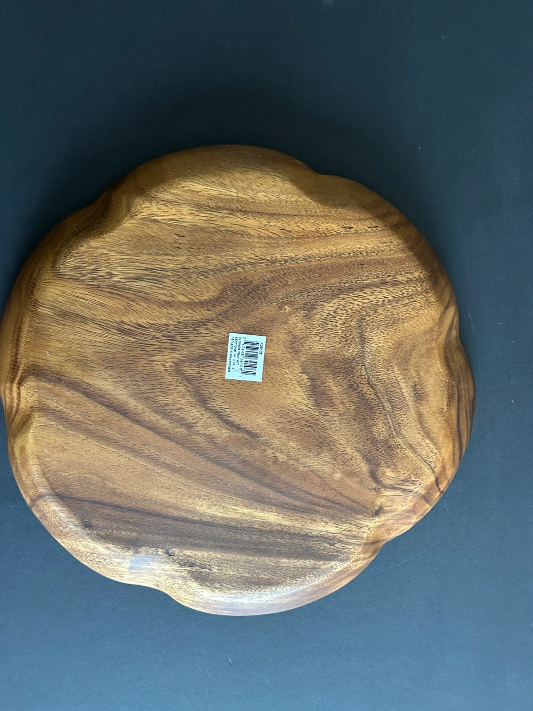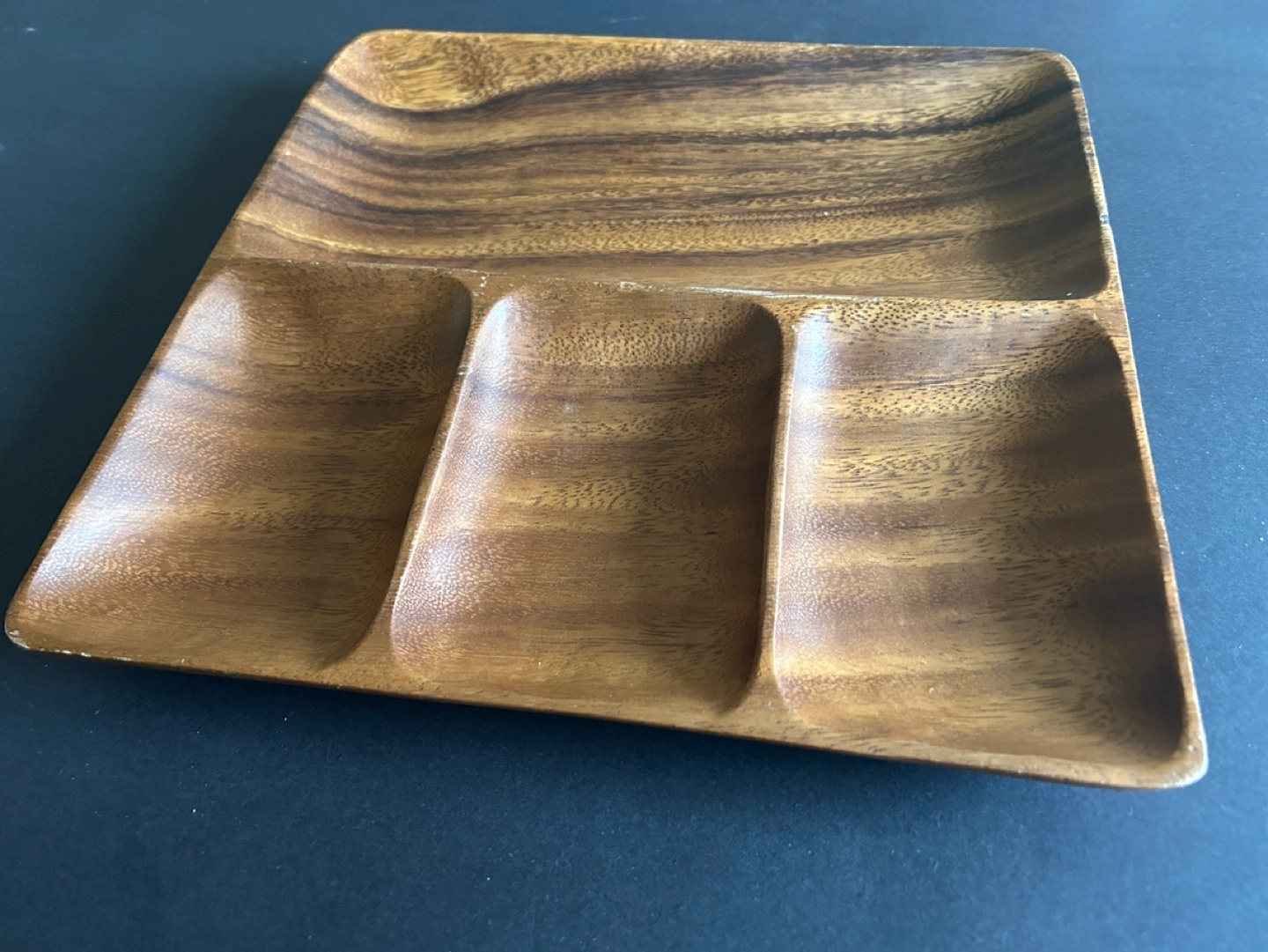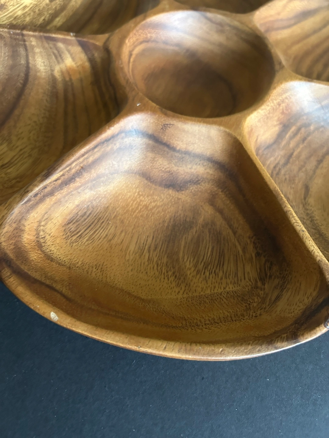 Set of two wooden serving trays, one square and one round. The square tray has four sections and the round tray has six sections. They are both made of wood.