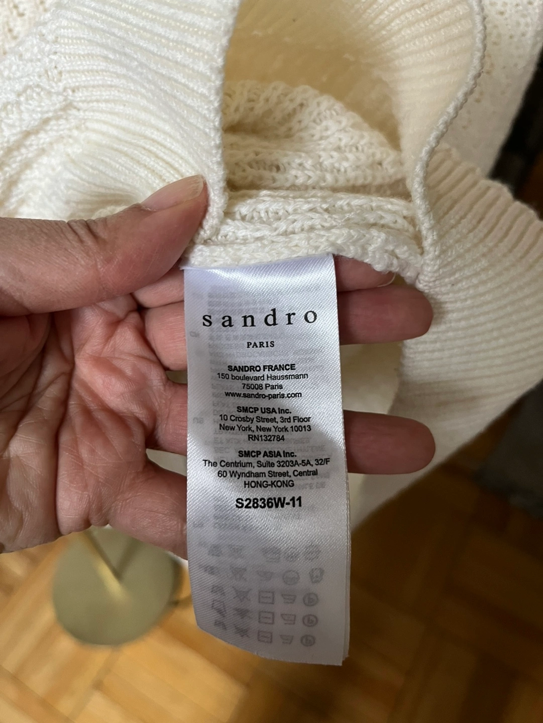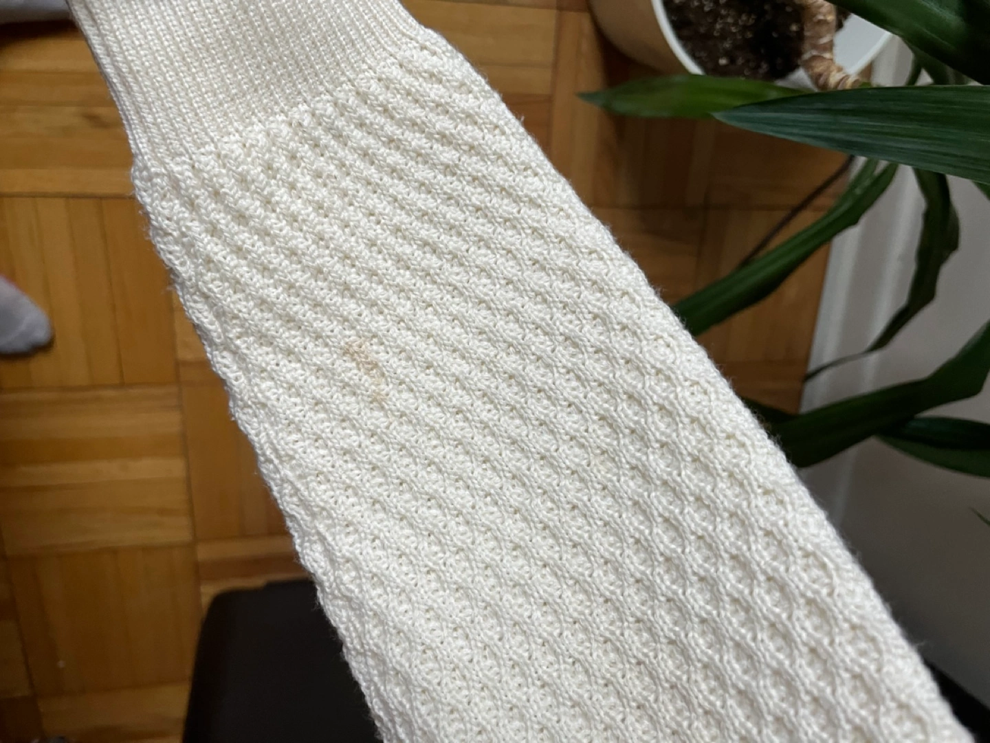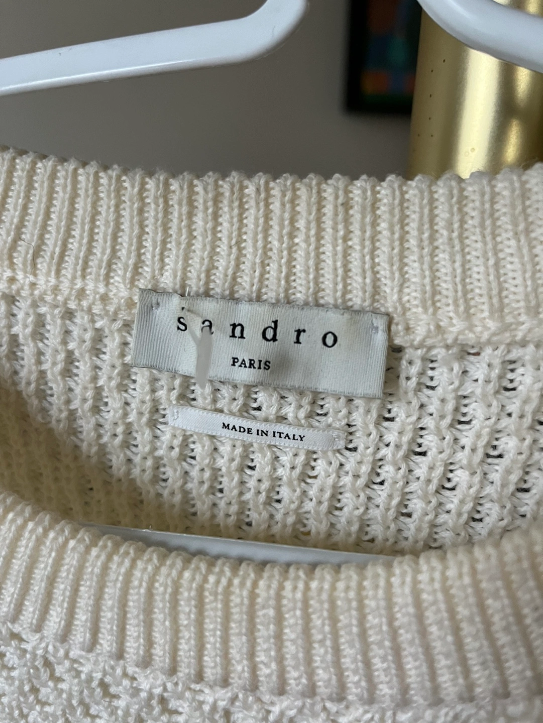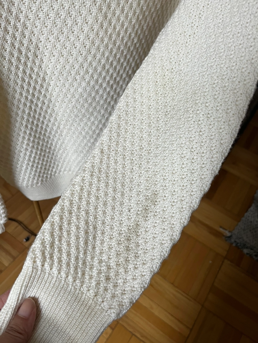 White knit sweater with a waffle texture. Long sleeves and crew neck. Made in Italy. Has minor flaws (see pic) small hole near bottom, and two faint marks on sleeves Size tag is missing but fits like a medium