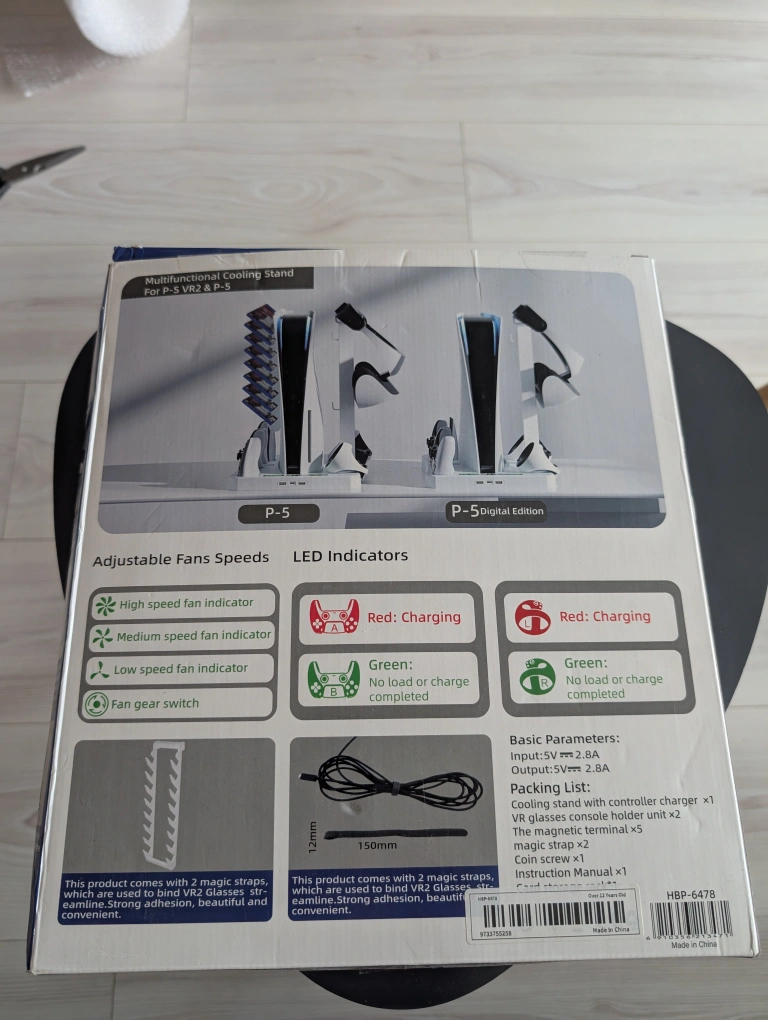 Multifunctional cooling stand for PS5 VR2 and PS5, includes 2 magic straps, a coin magnetic terminal, and VR glasses and joysticks holder. Adjustable fan speeds and LED indicators.