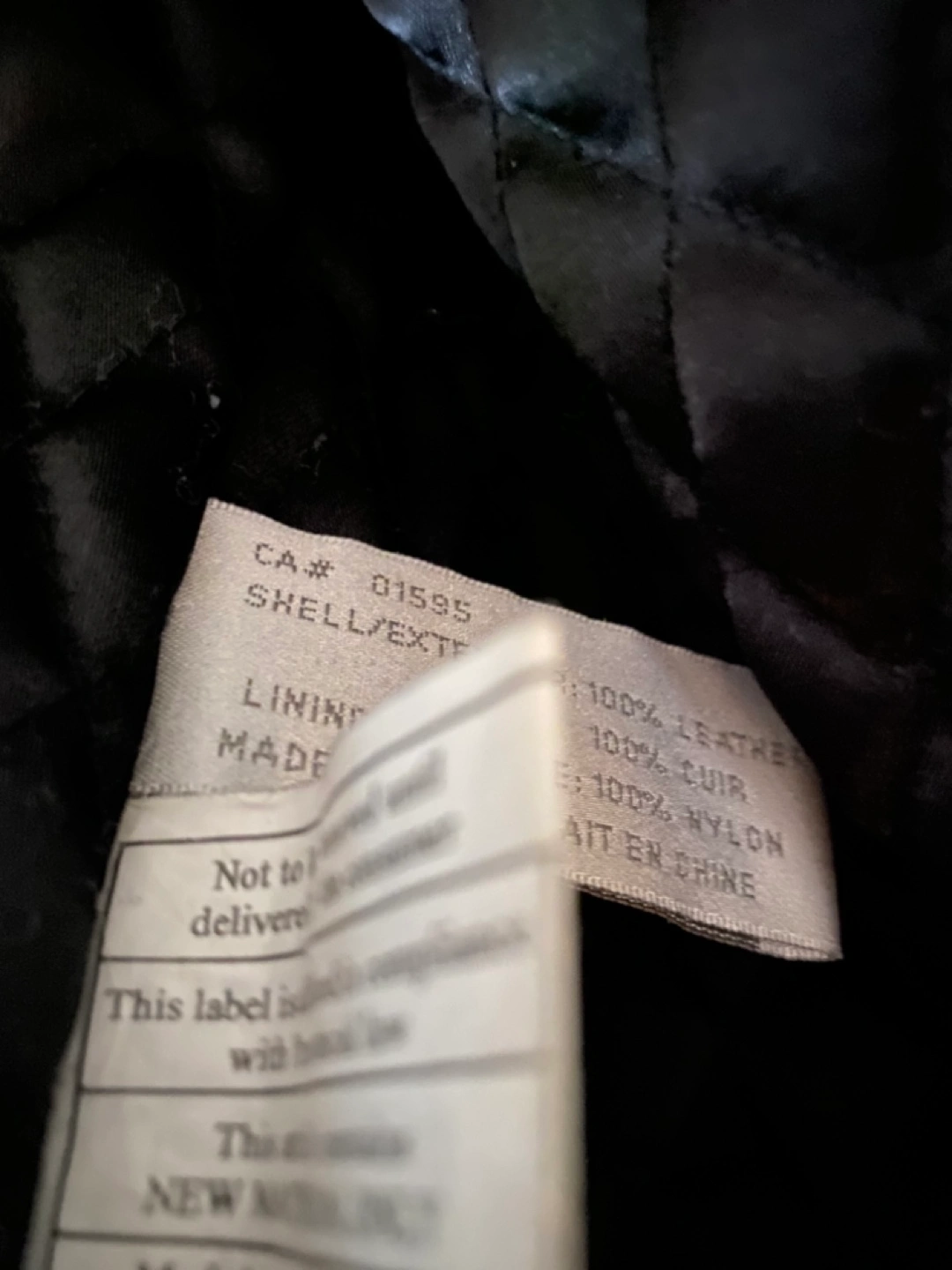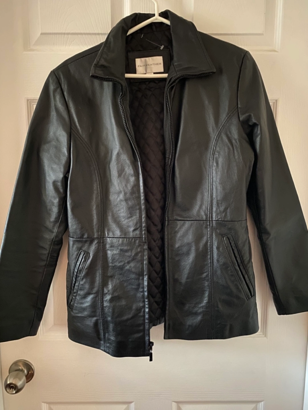 Black leather jacket. Size S/S. Zipper closure. Two front pockets.